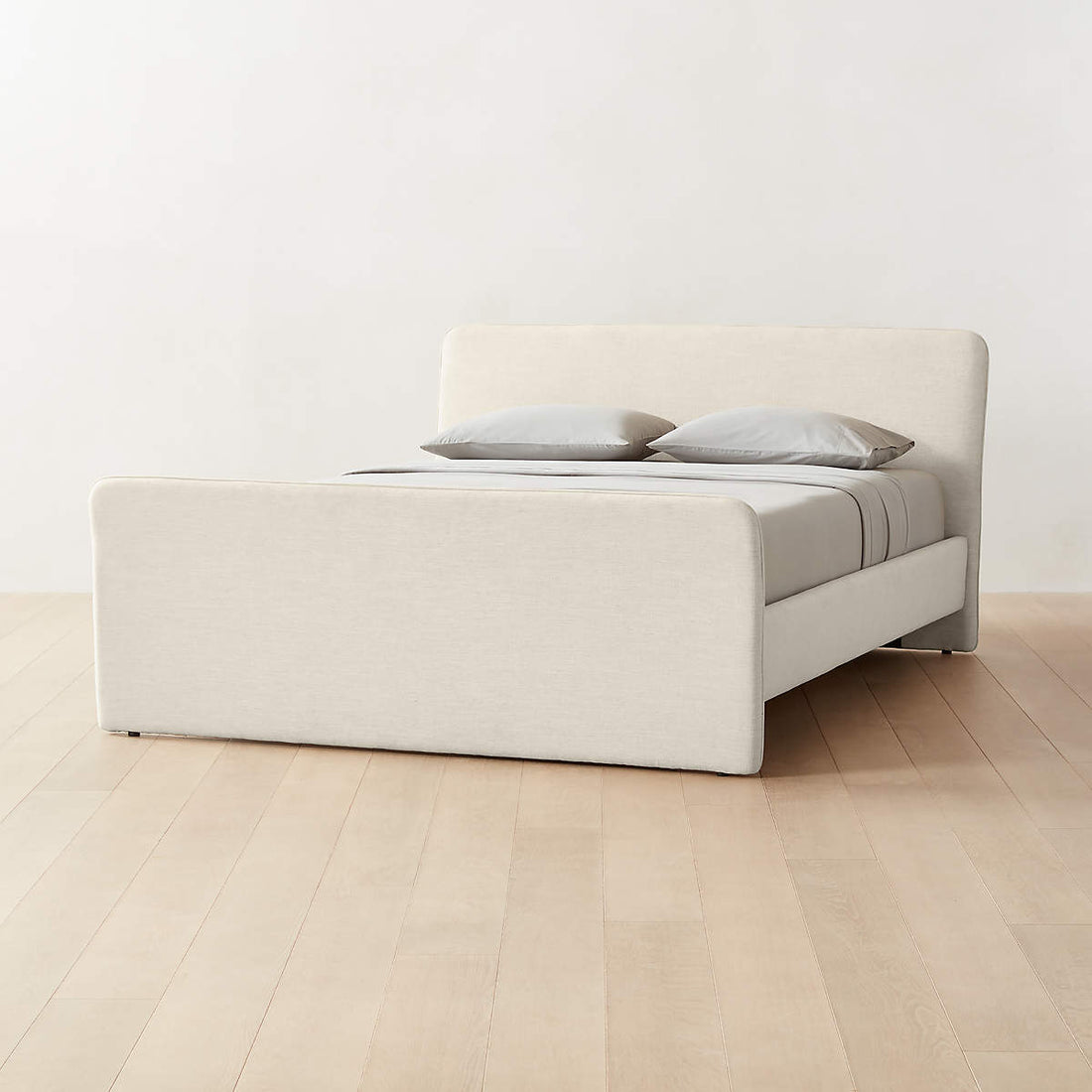 Upholstered bed is a modern take on the traditional sleigh bed silhouette. Angled headboard and...
