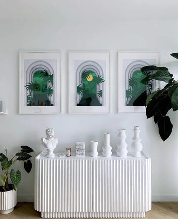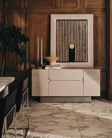 Handmade grasscloth with subtle waves and imperfections wraps this credenza in natural texture and beauty....