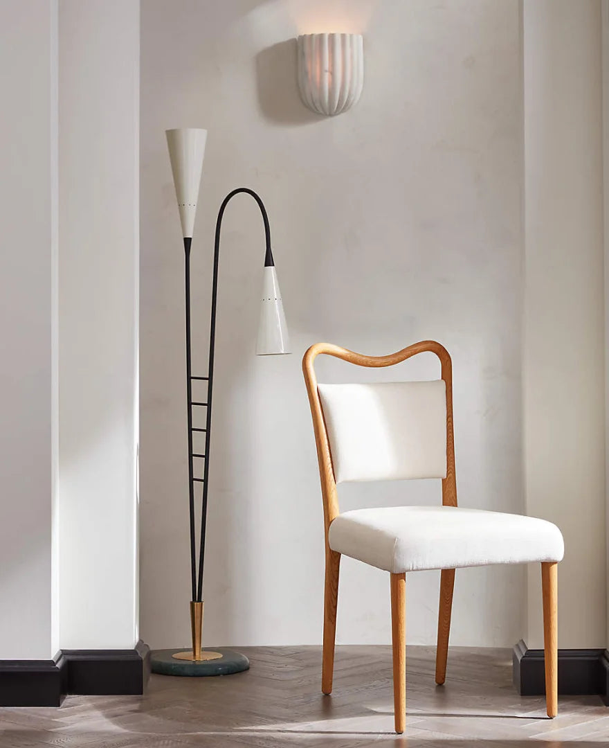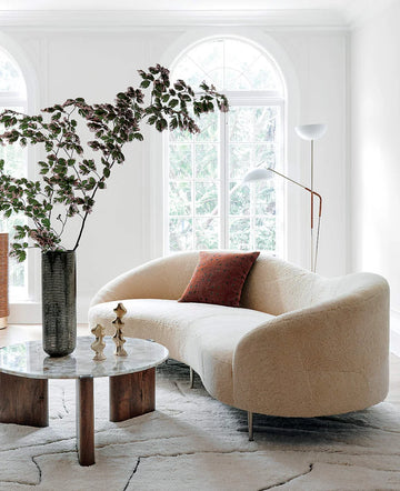 Sofa has a graceful arching silhouette, mirrored by bent-wood legs that follow its curve. Semi-detached...