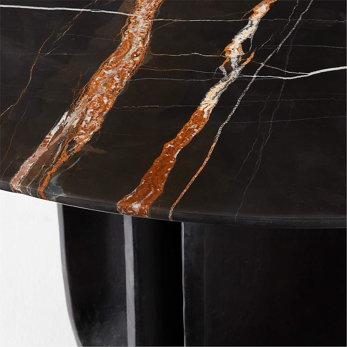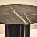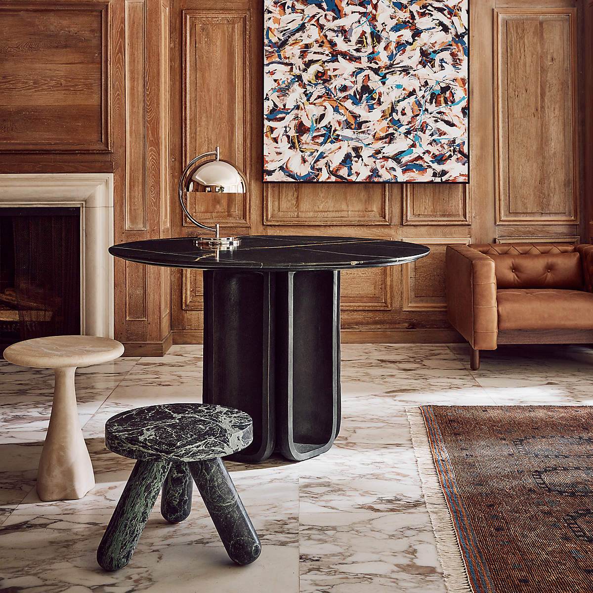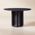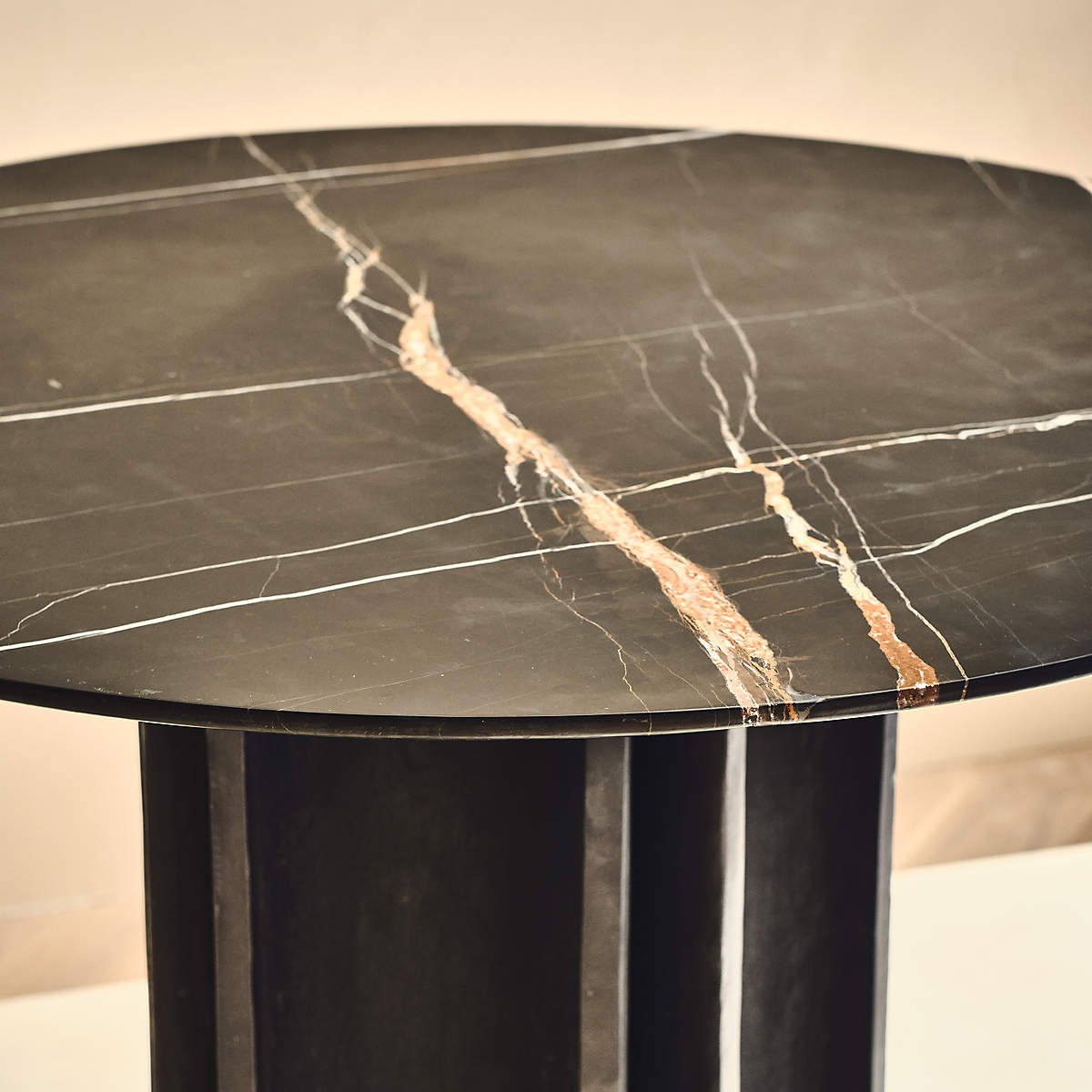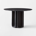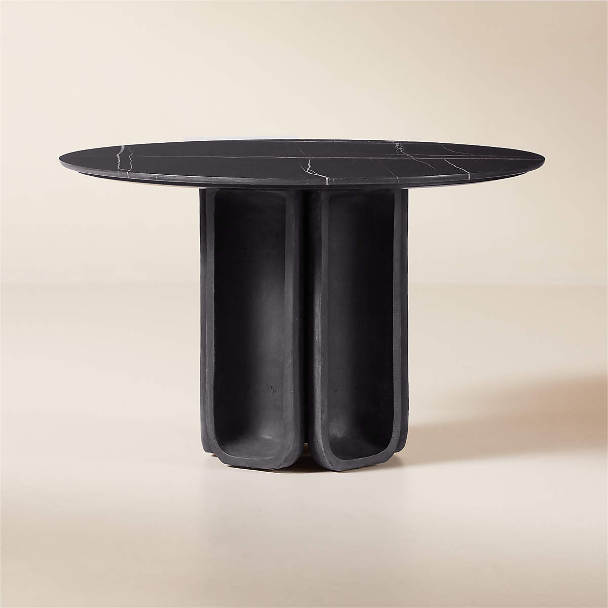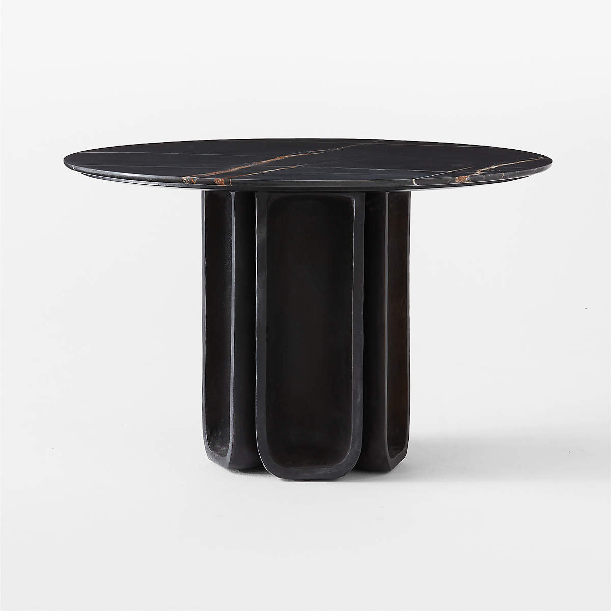 Inspired by the cool minimalism of 1970s Brutalism, round marble dining table exemplifies the movement's sculptural forms. The geometric symmetry expressed in cast metal at the base is grounded by the natural beauty of the honed marble top.