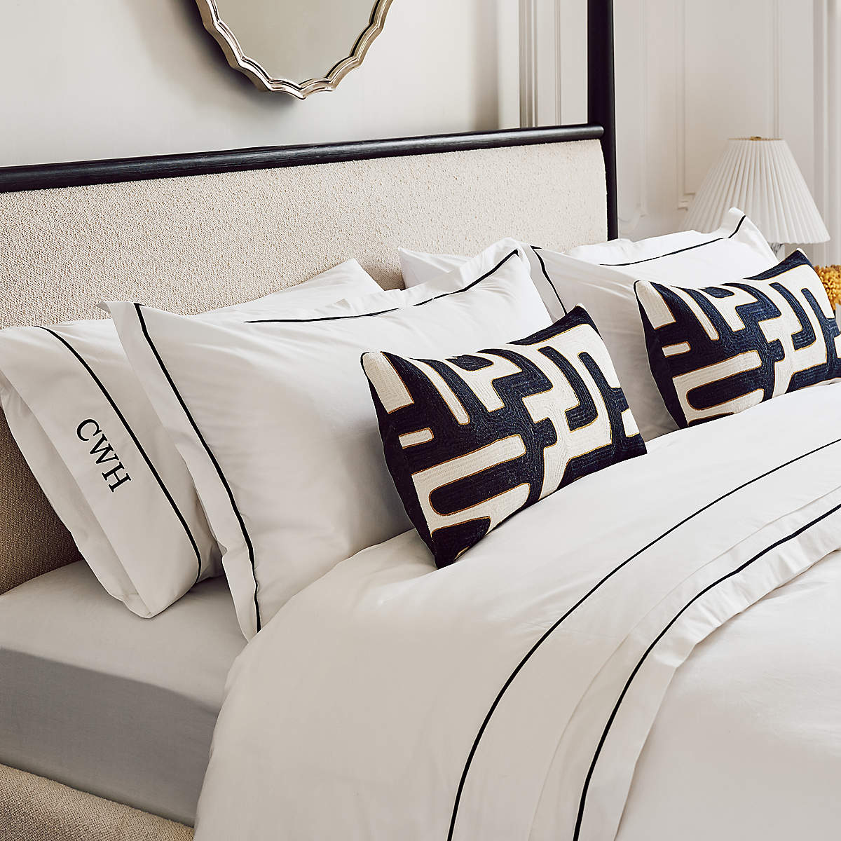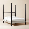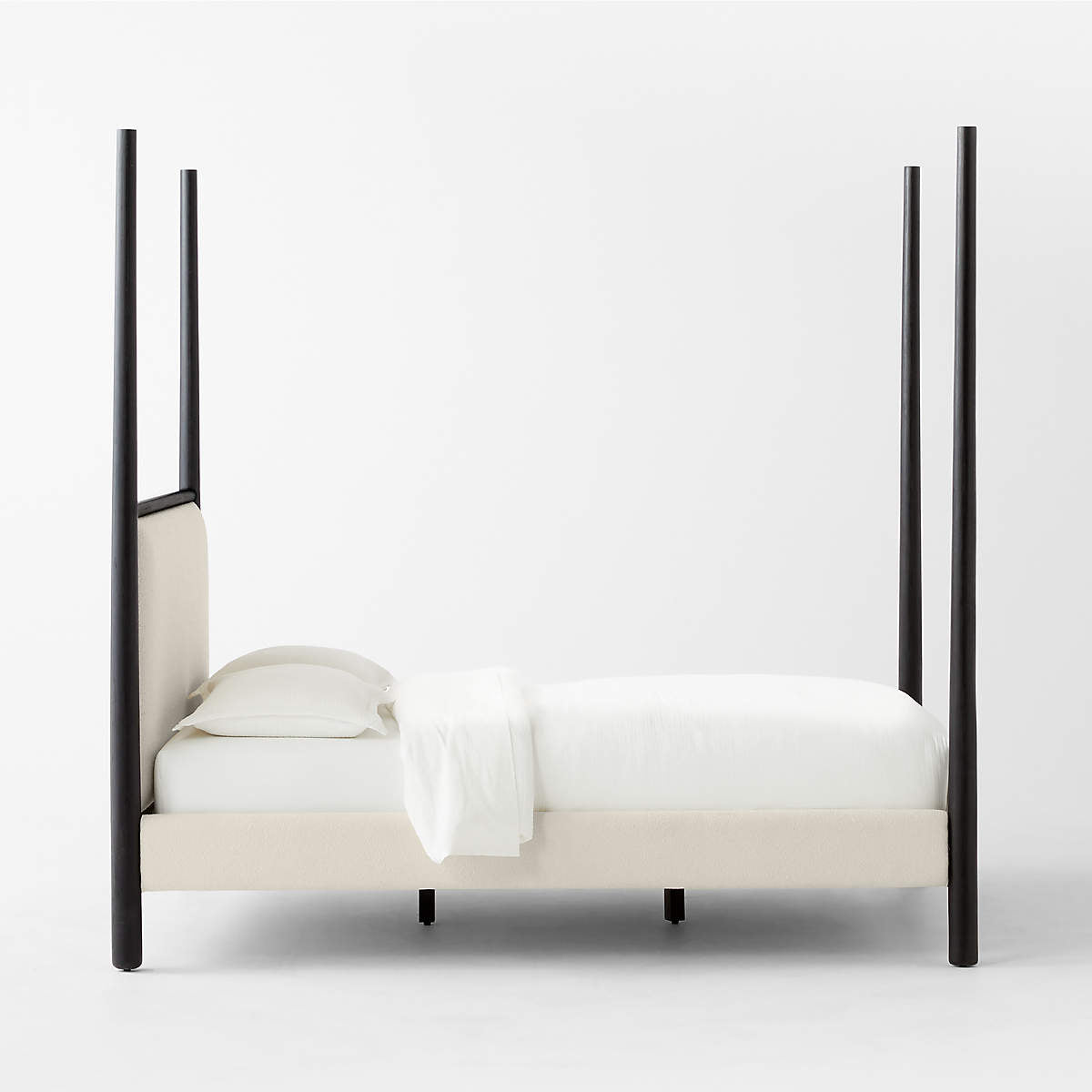 Four-poster bed has a commanding presence. Crafted with mahogany, the frame is finished in black and wirebrushed to bring out the wood's texture. Ivory boucle wraps the headboard and footboard for a chic contrast and a supremely cozy accent.