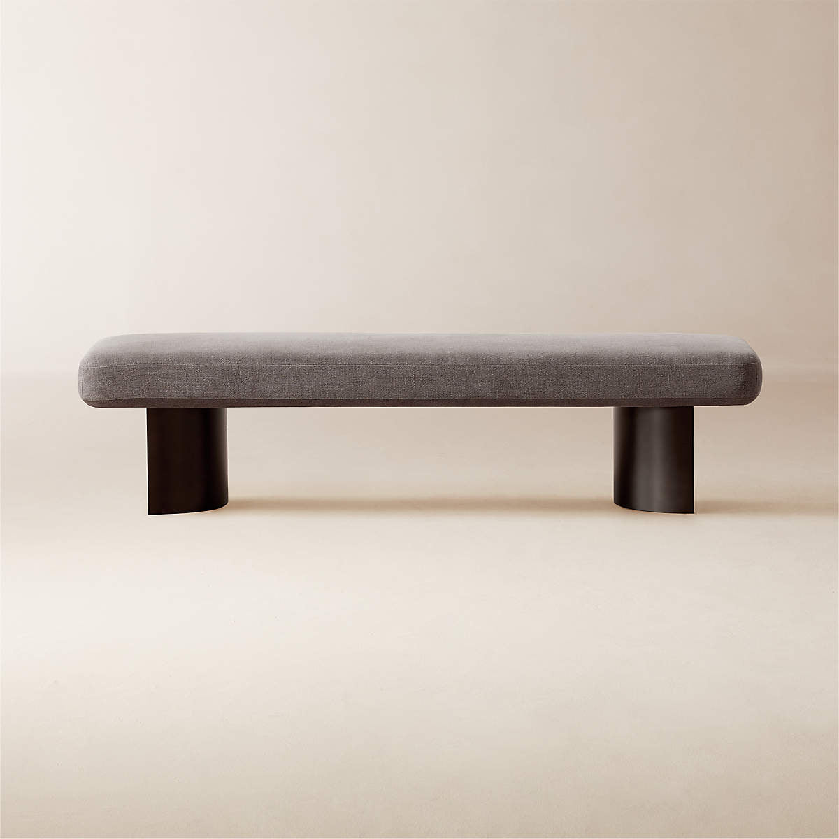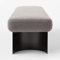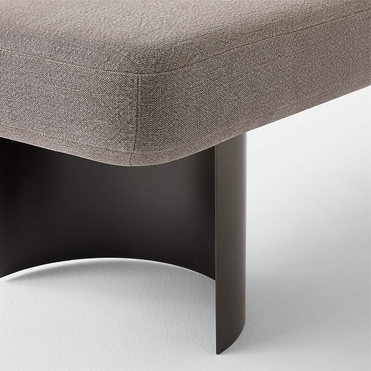 This upholstered bench is distinguished by a refined, minimalist silhouette. Dark steel legs are molded into an unexpected demi-lune shape as a counterpoint to the plush linen seat. Sized perfectly for the entryway, living room or end of the bed