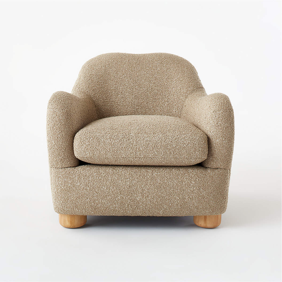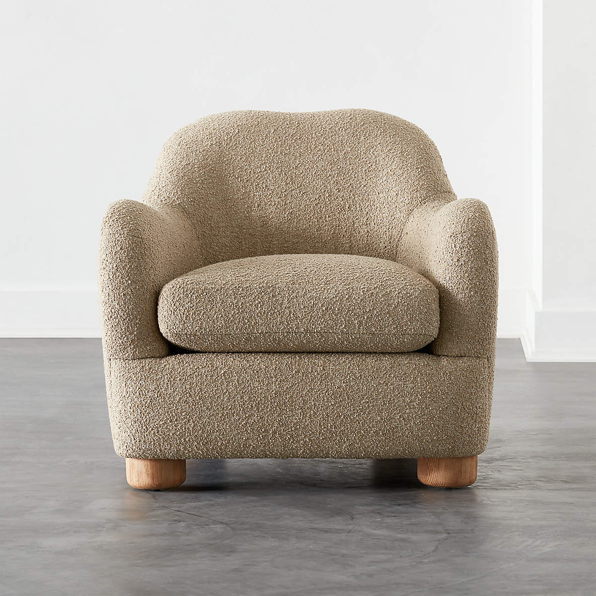 Boucle takes on camel-colored hues in loungeable chair. Bubbly and oversized in shape, with a wood frame and rounded legs made of solid bleached oak.