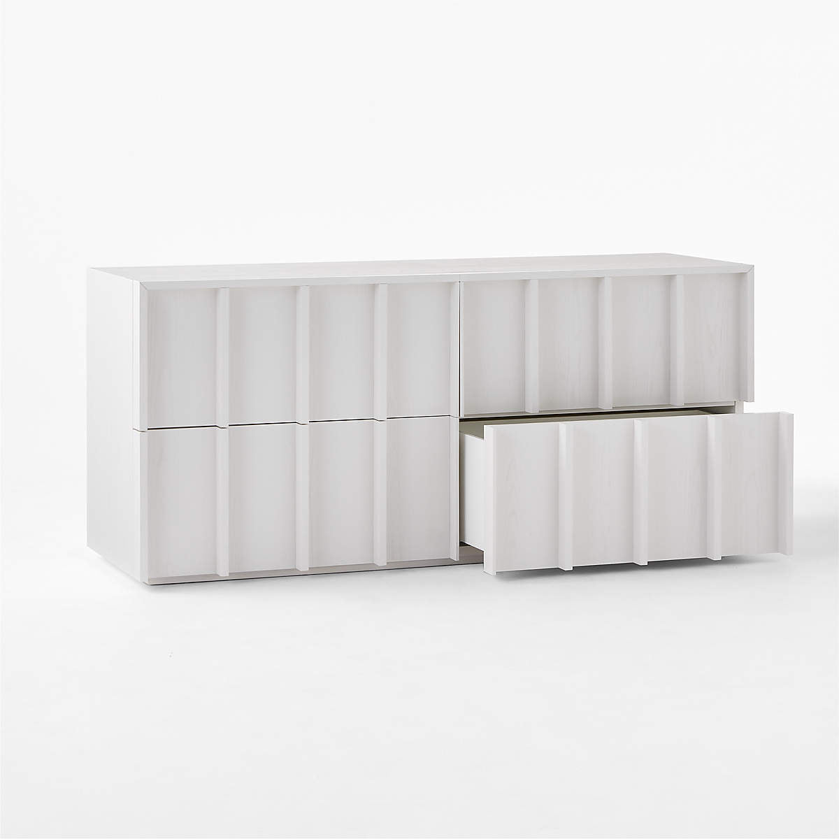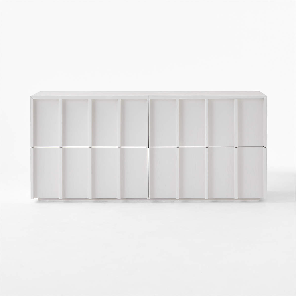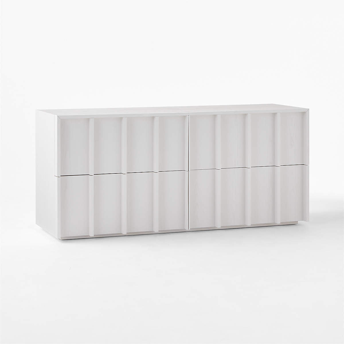 Four-drawer dresser is crafted from ash wood. Striking vertical beams capture the refined restraint of minimalist design, while sleek drawers, uninterrupted by hardware, are mounted on soft-close glides for modern appeal. Ivory finish creates a soft, glossy effect.
