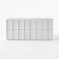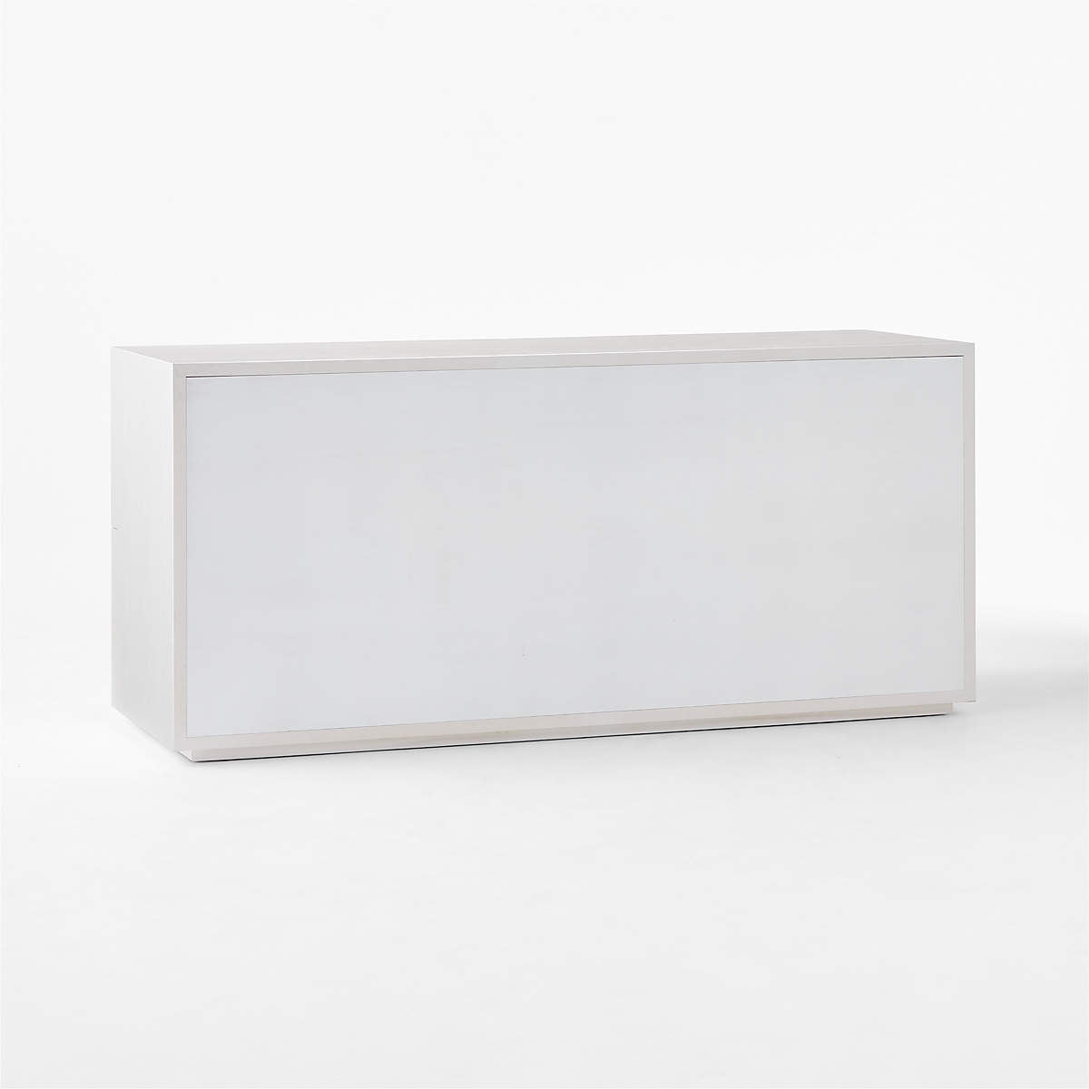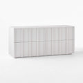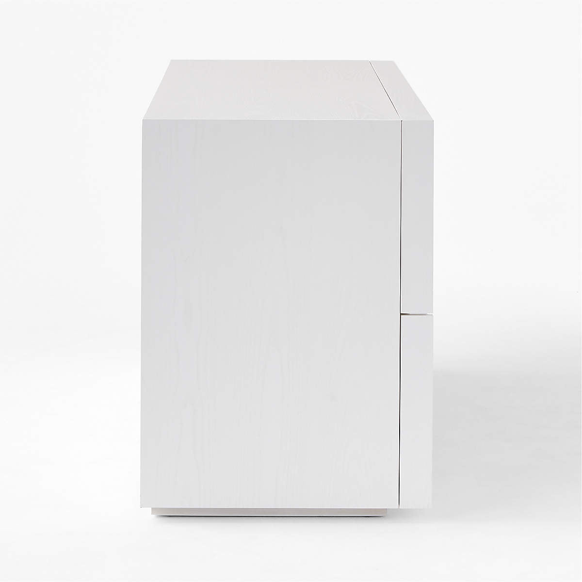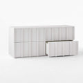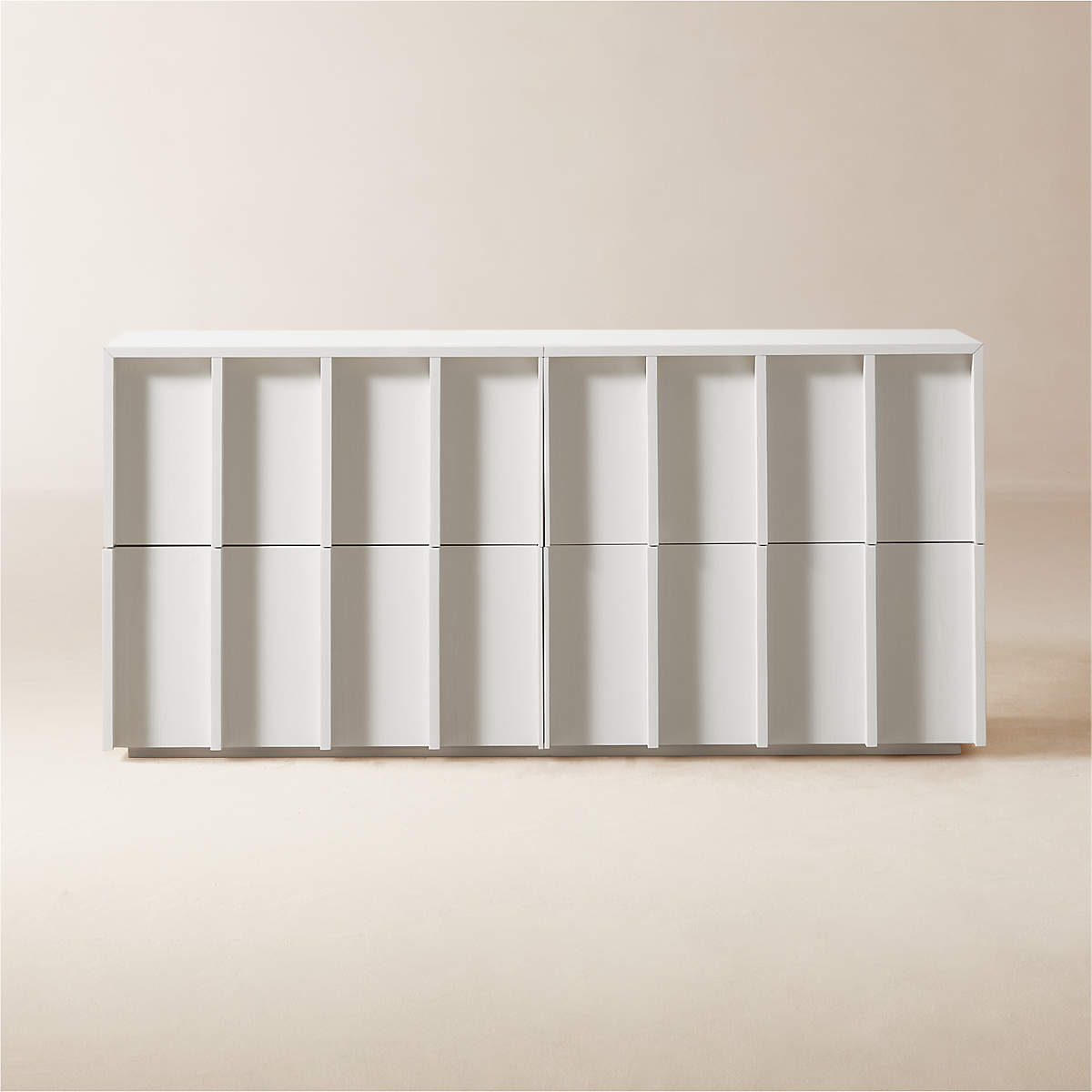 Four-drawer dresser is crafted from ash wood. Striking vertical beams capture the refined restraint of minimalist design, while sleek drawers, uninterrupted by hardware, are mounted on soft-close glides for modern appeal. Ivory finish creates a soft, glossy effect.