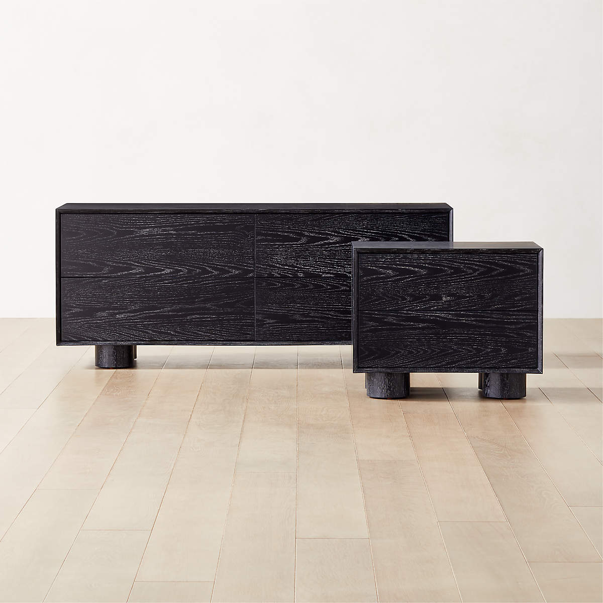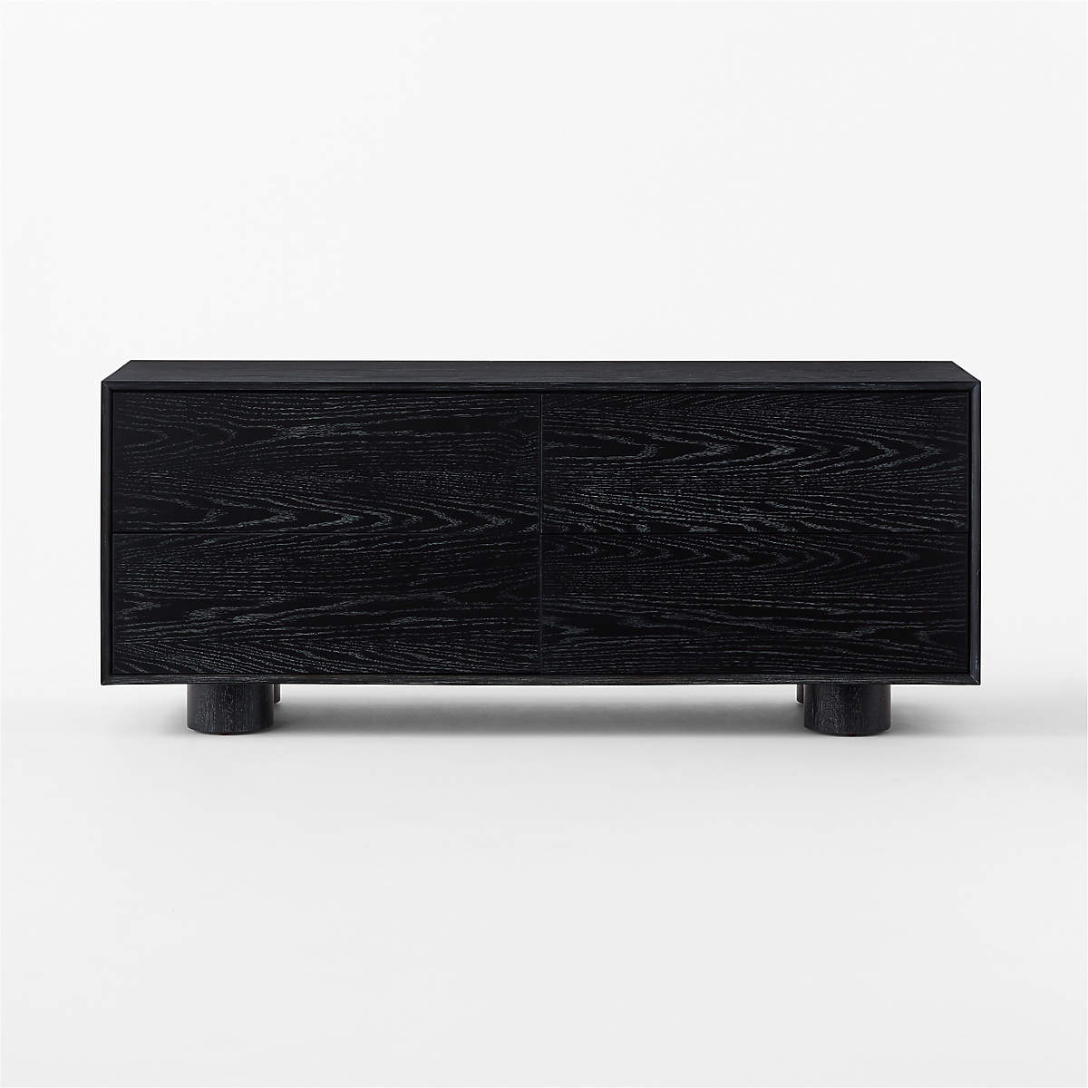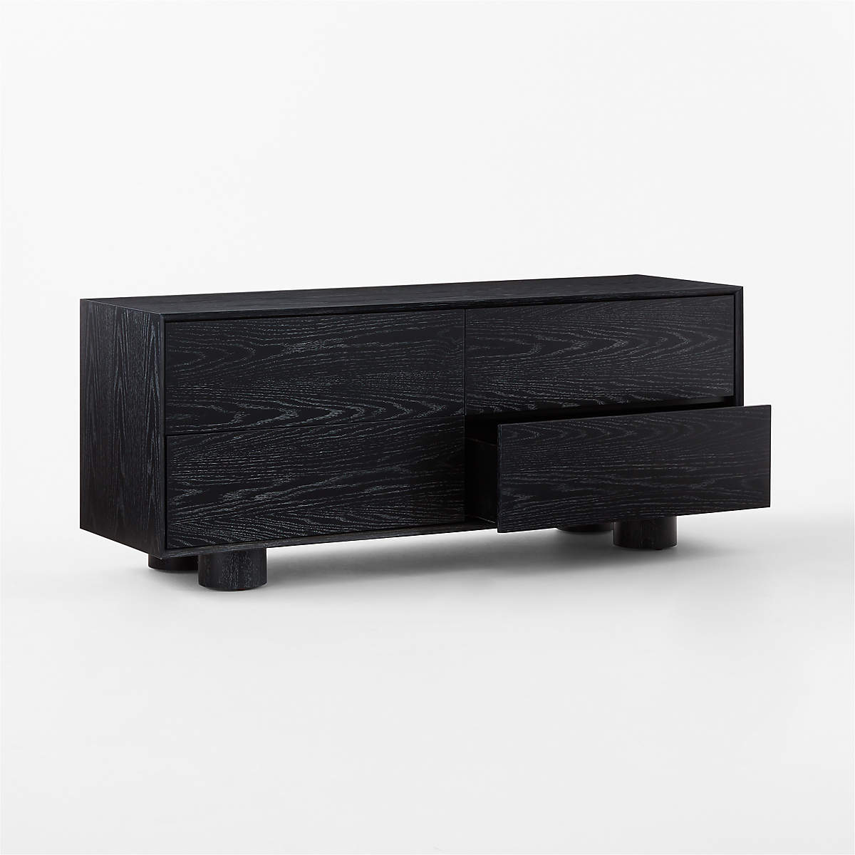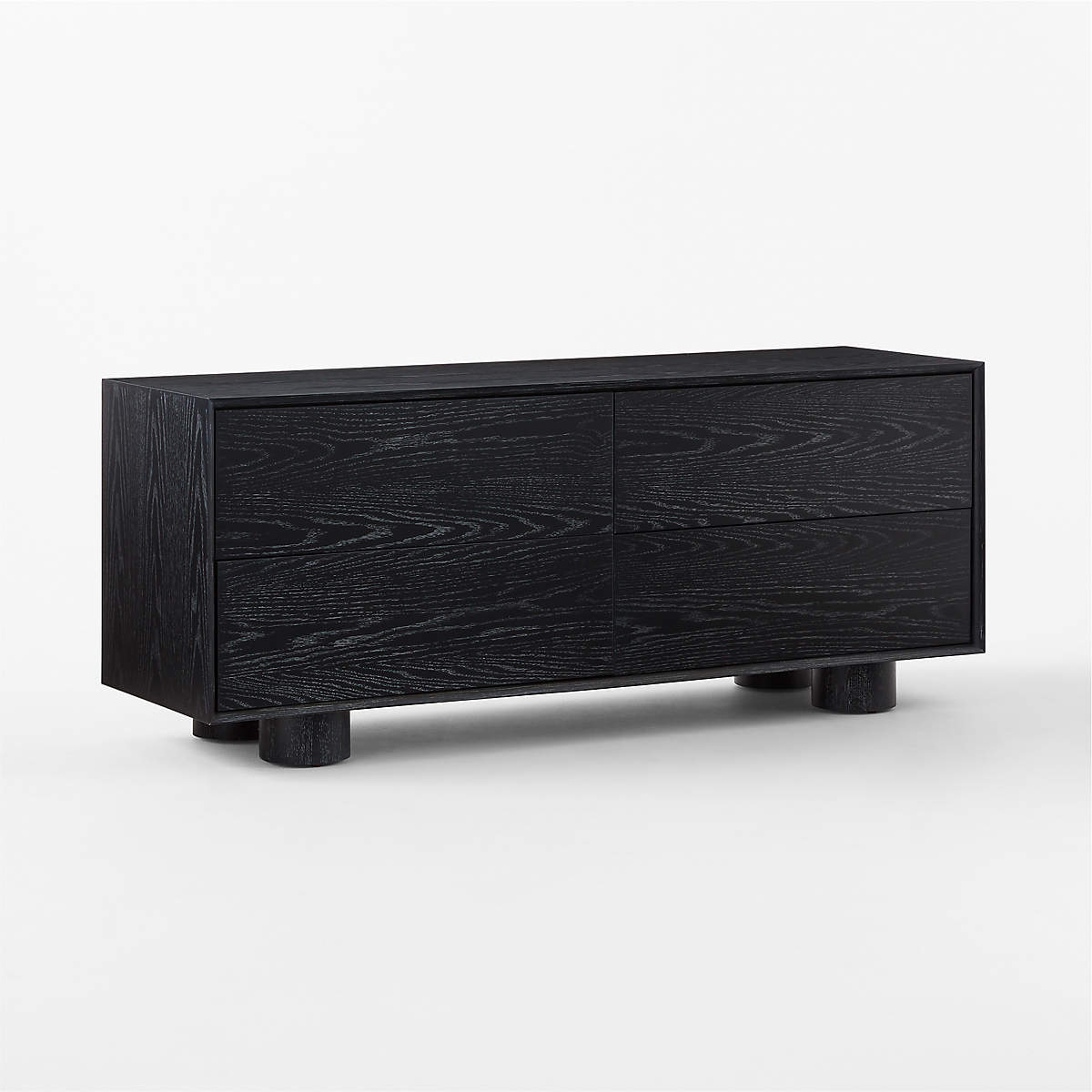 Long, low dresser has a straightforward profile and well-considered details. Thick cylindrical legs support a frame of black cerused oak, while four push-to-open drawers and a beveled edge enhance the sleekness