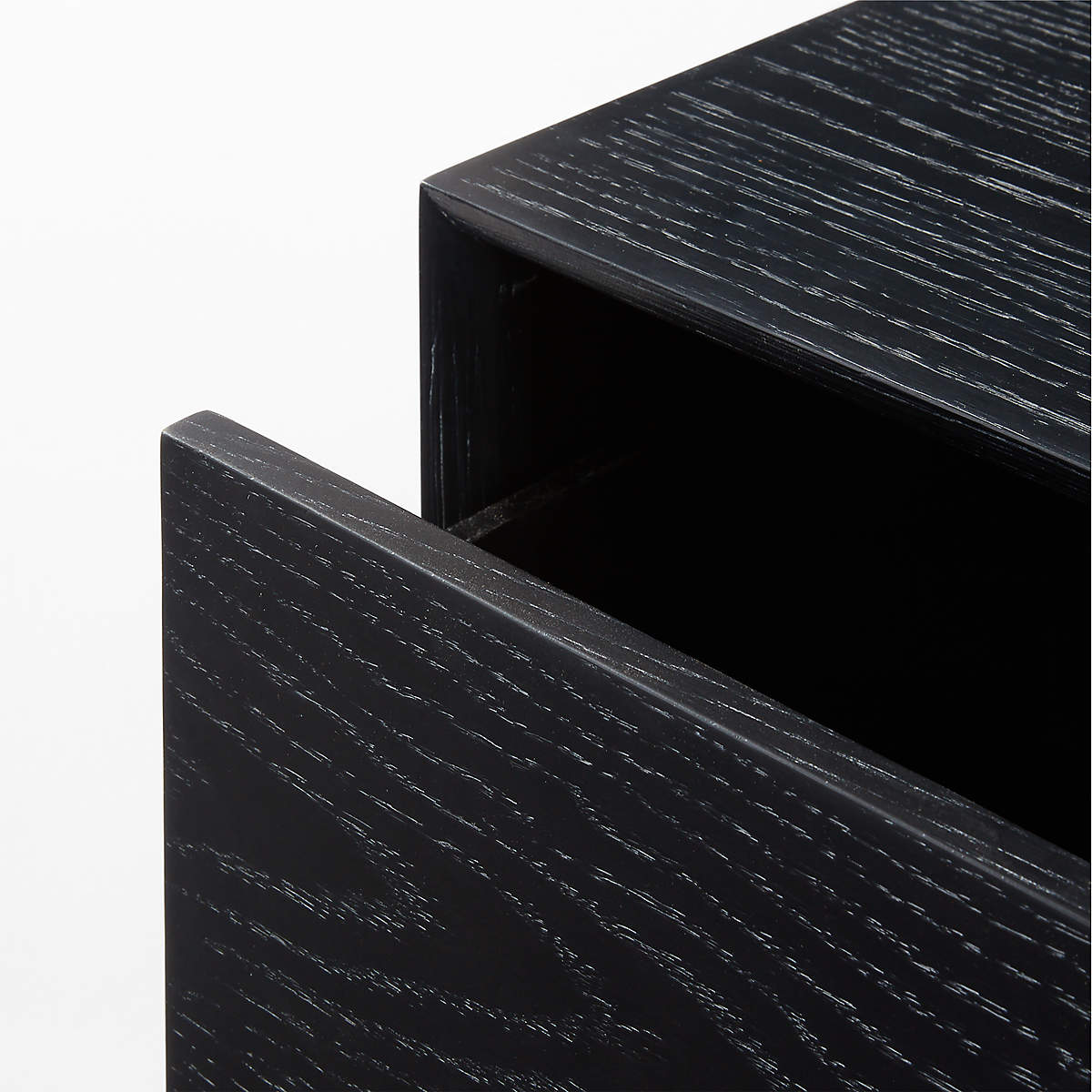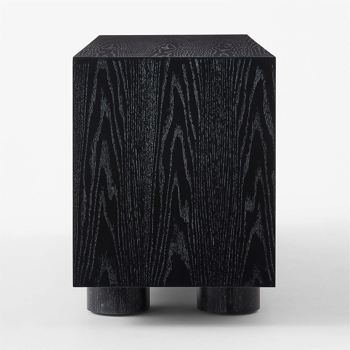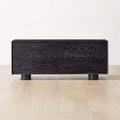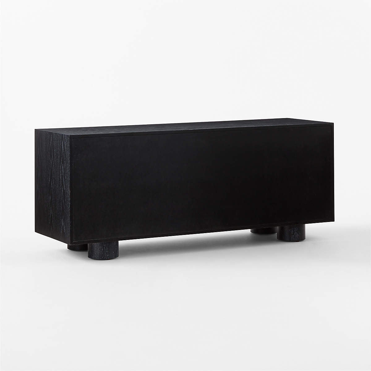 Long, low dresser has a straightforward profile and well-considered details. Thick cylindrical legs support a frame of black cerused oak, while four push-to-open drawers and a beveled edge enhance the sleekness