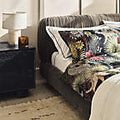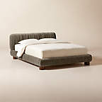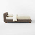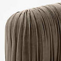 Ruched velvet platform bed brings lush materiality to the bedroom. The headboard, footboard and rails are fully enveloped in plush velvet with exquisite ruched detailing. Stout cylindrical legs, crafted of oak, keep the look modern.