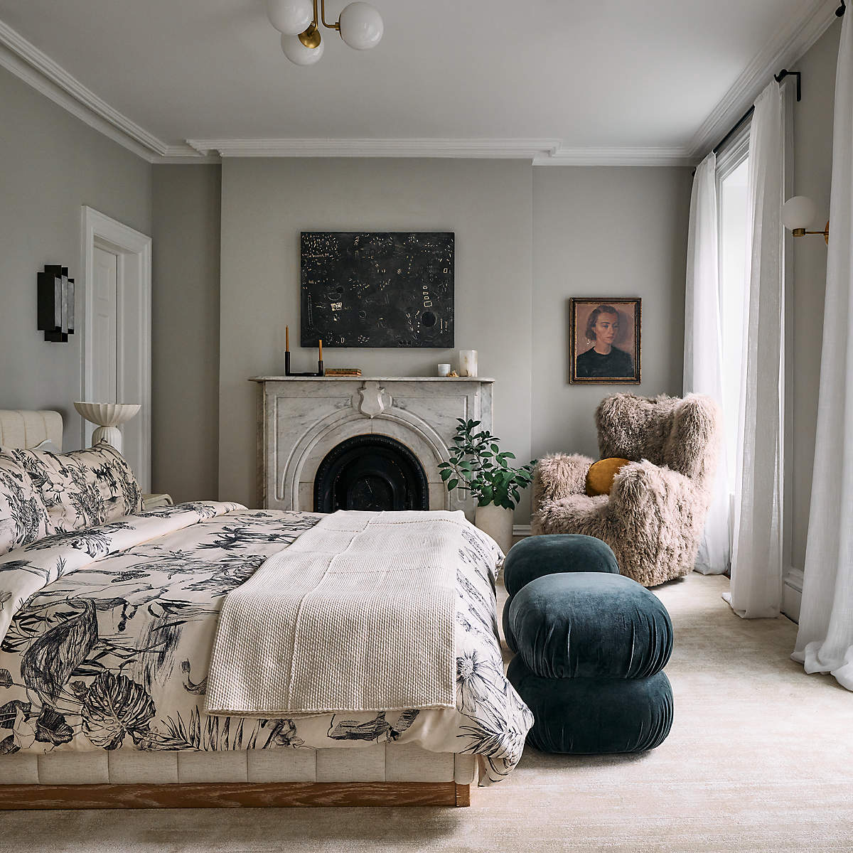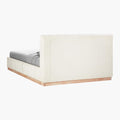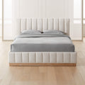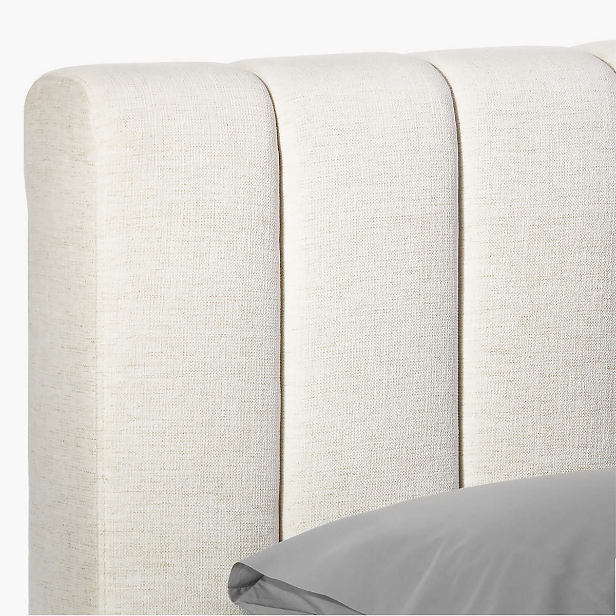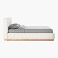 Cushy channels of lush white upholstery line the length of this finely tailored bed. Plinth oak wood base keeps a minimal profile finished in a subtle whitewash. A true statement piece. Performance poly/linen upholstery stands up to wear.