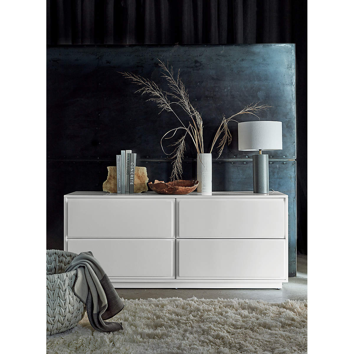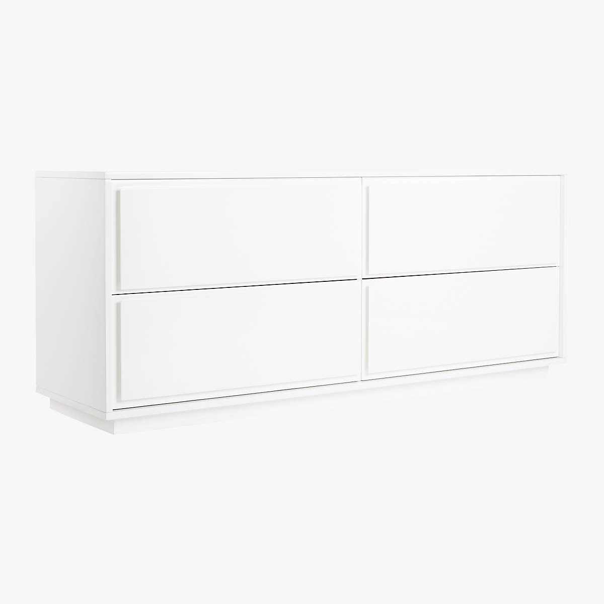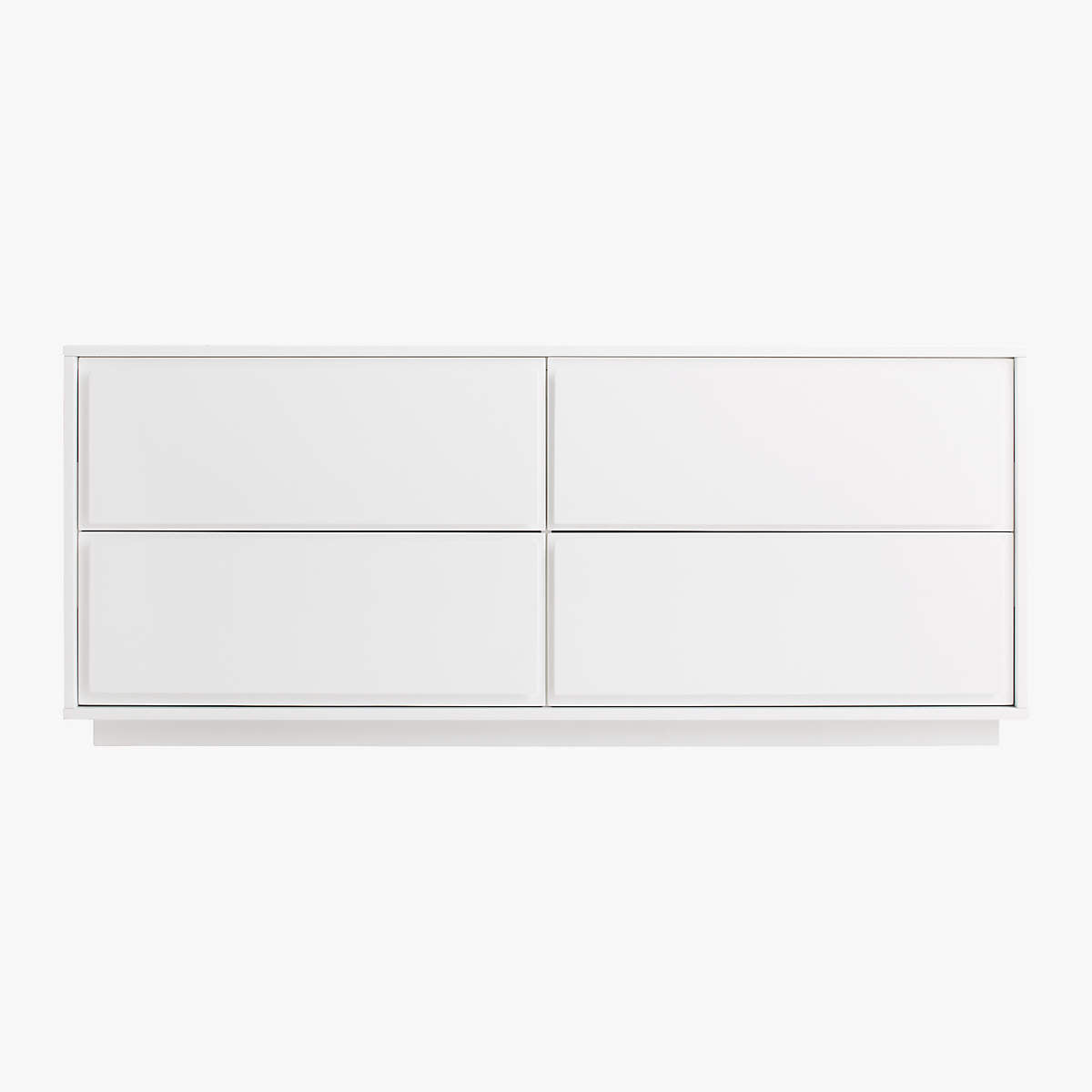Minimal dresser takes a modern turn in glossy white lacquer. Four roomy drawers cut a clean line with recessed drawer panels rather than traditional hardware. Slim plinth base keeps it sturdy and sleek.
