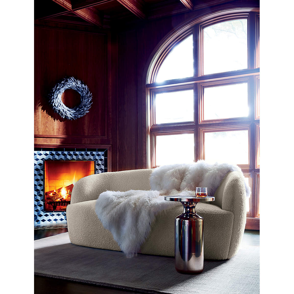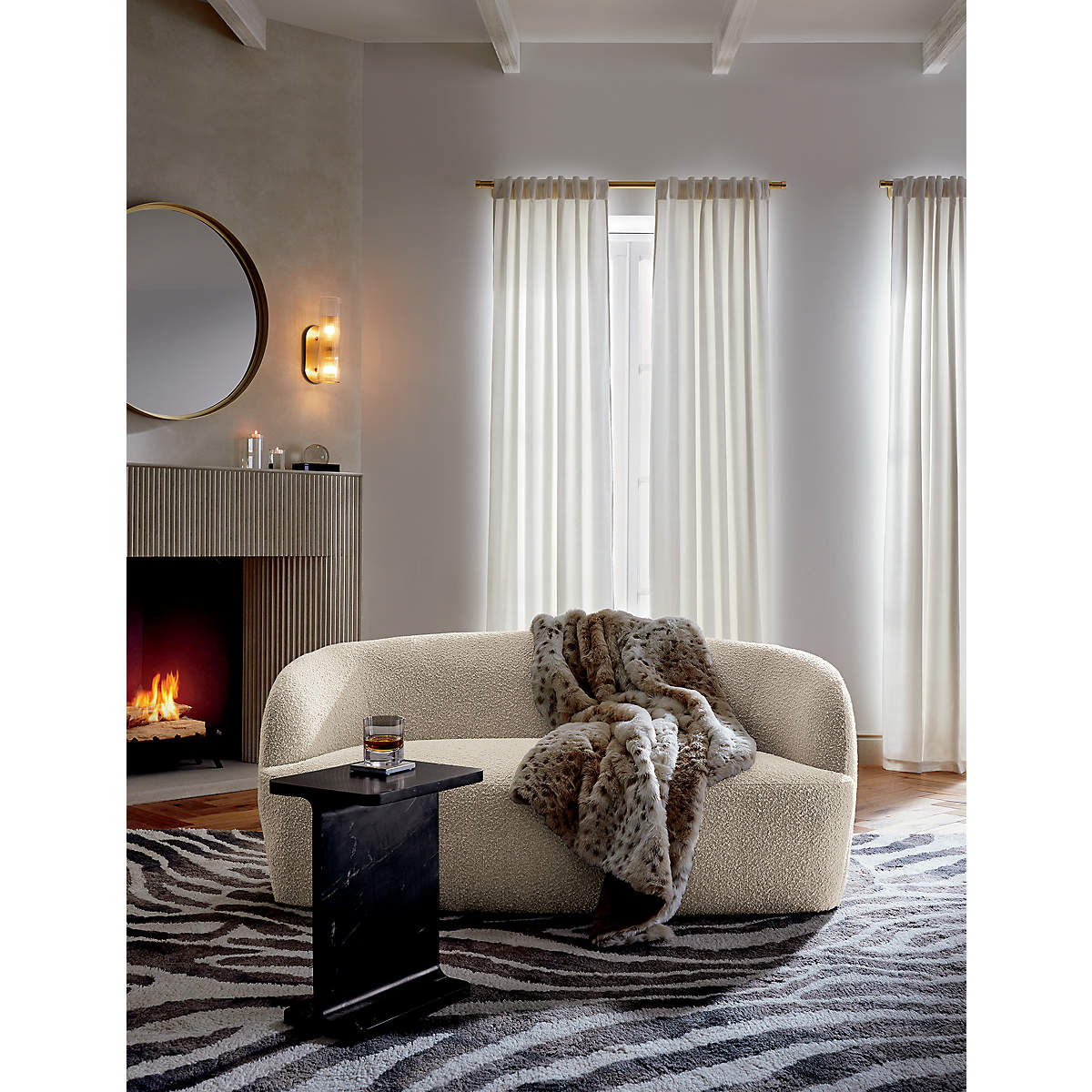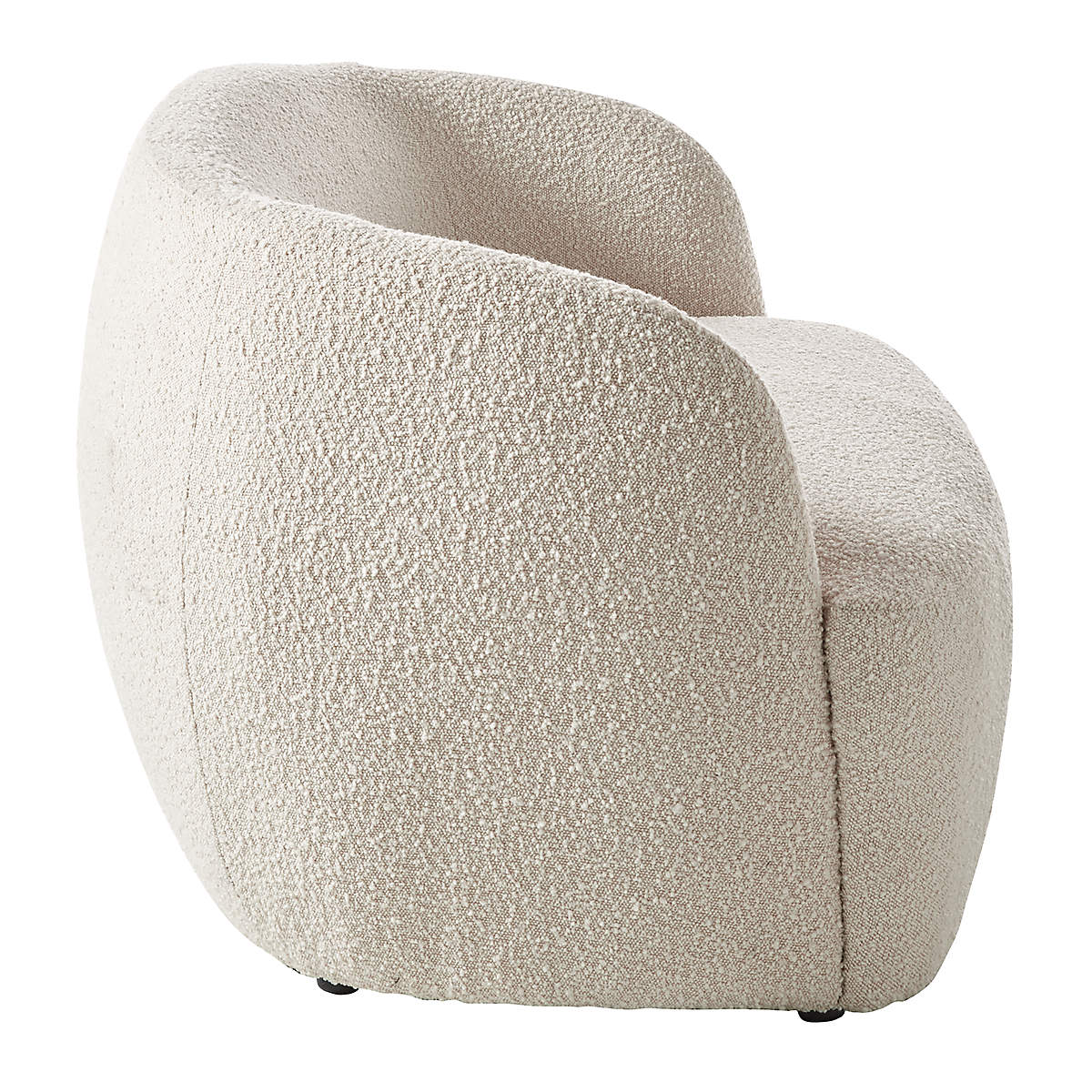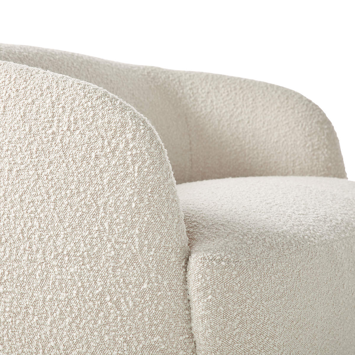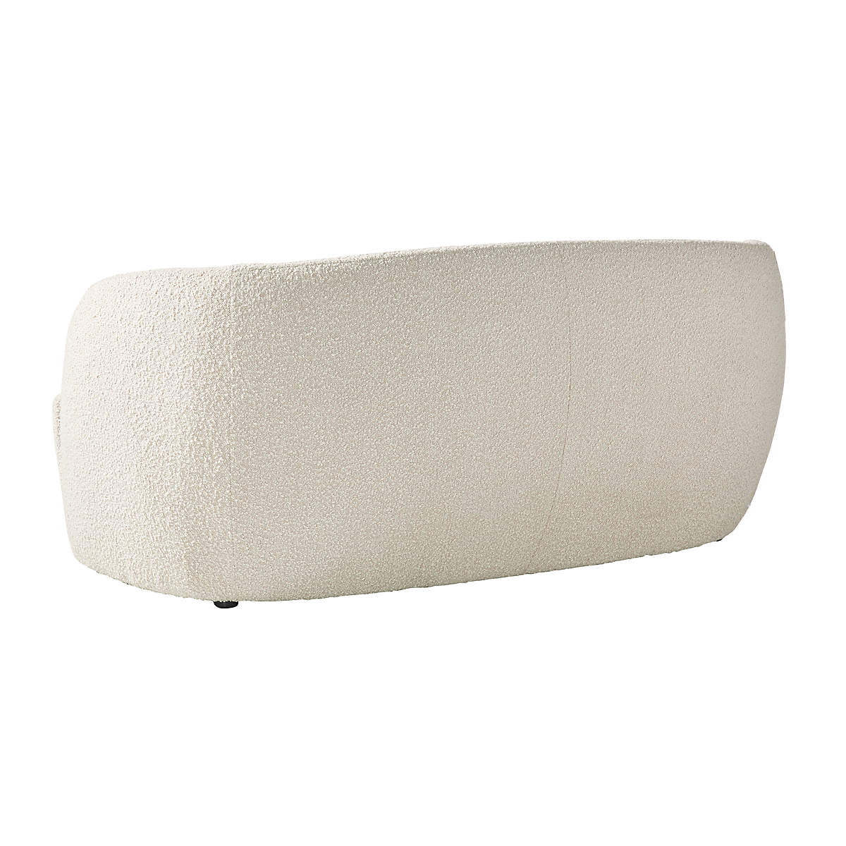 Plush loveseat from WOBB Covered in a rich, textural boucle-like fabric, the loveseat feels slightly vintage with a mod silhouette that highlights the high-end upholstery