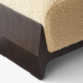 This boucle bench is defined by a crisp, angular profile. The American white oak frame supports a generously cushioned seat upholstered in a camel boucle for rich, textural contrast. The oak is finished with a dark brown stain and wirebrushed, adding subtle texture to the wood's characteristically straight grain.