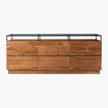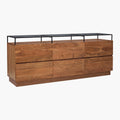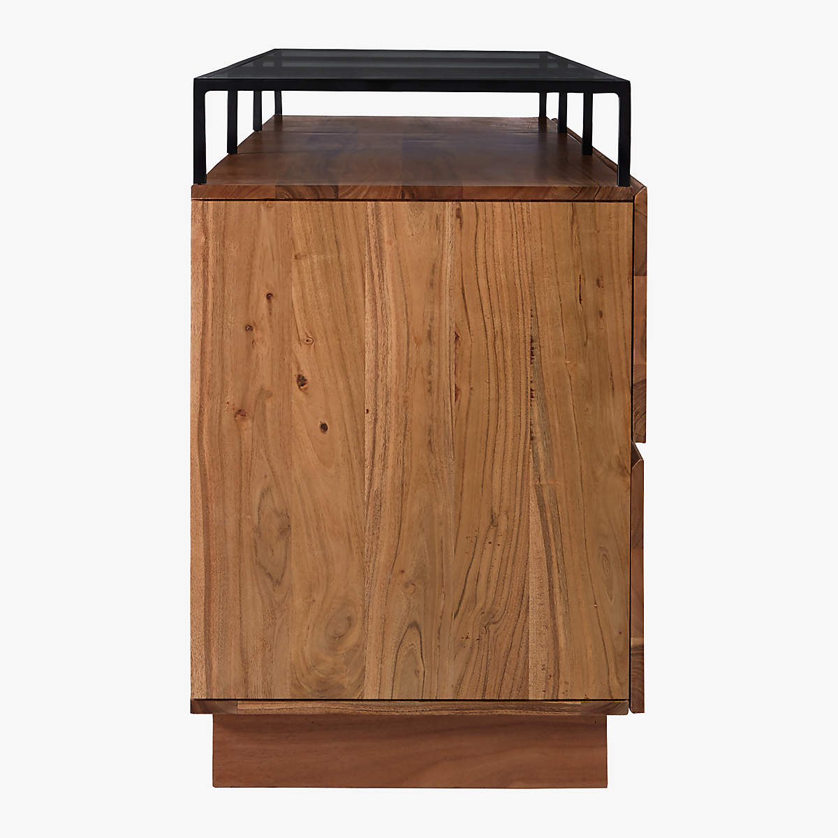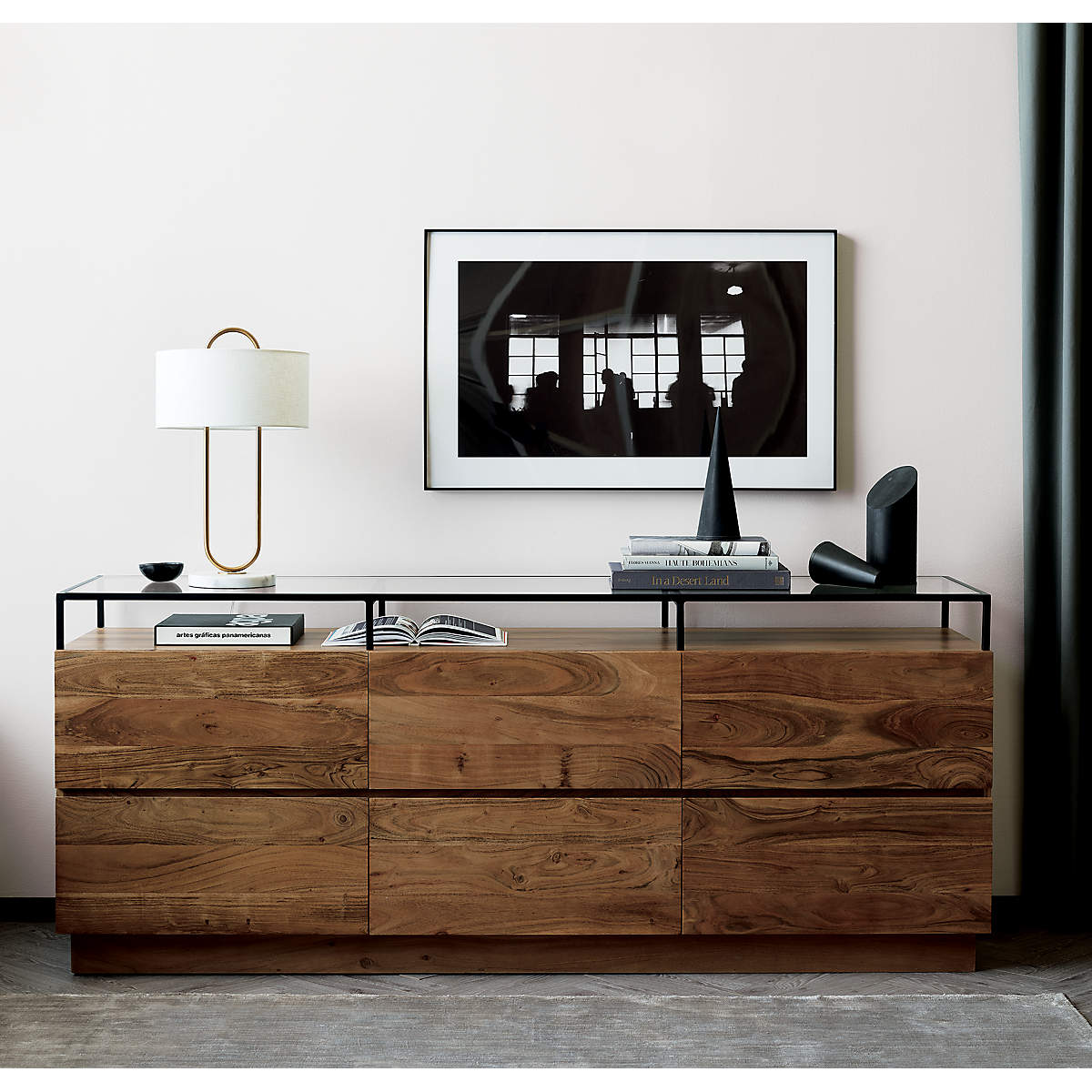 Slim black iron frame floats atop six solid acacia wood drawers and tops dresser off in clear glass. Best of both storage worlds, open shelf displays jewelry/sunnies/accessories while drawers hold everyday essentials.
