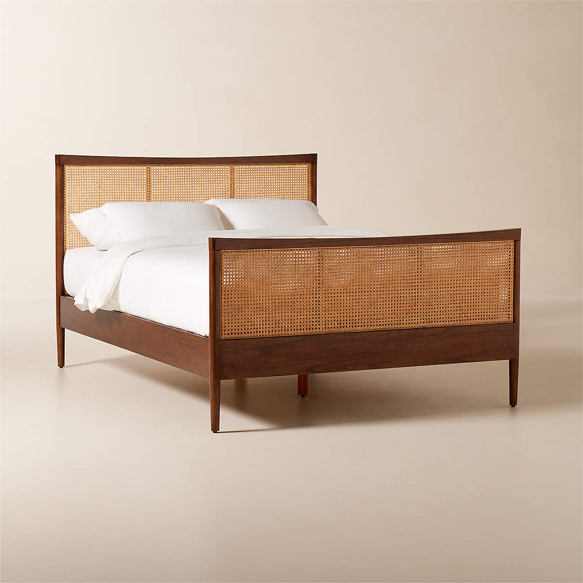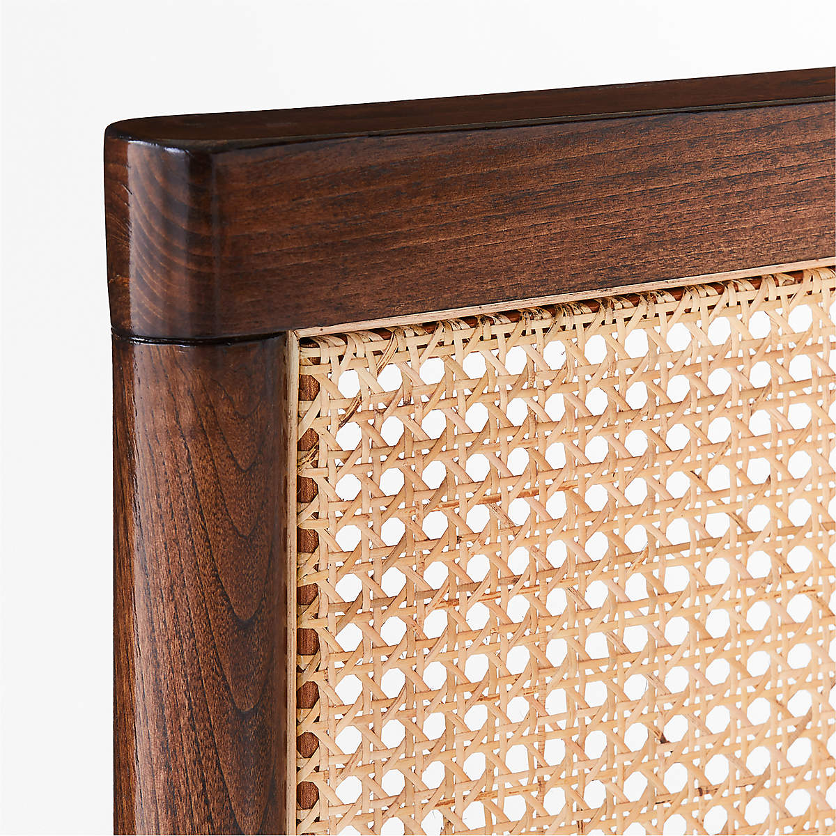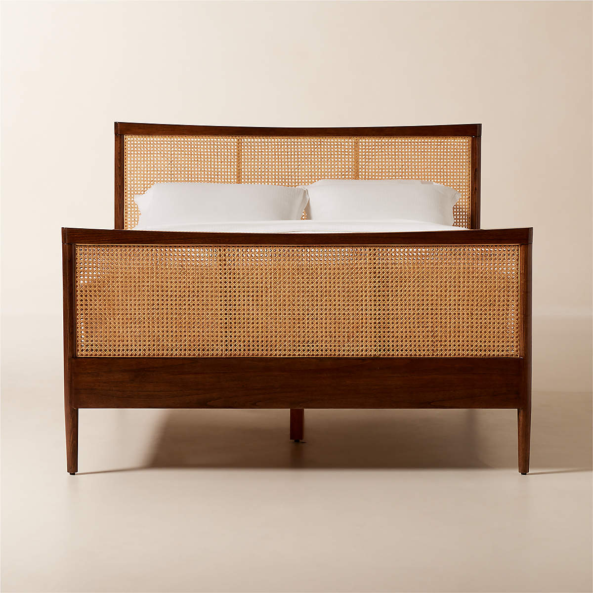 Natural cane bed draws attention with its inviting warmth and organic materiality. Framed in subtly curved sungkai wood, the tall head- and footboard feature open and airy natural cane panels. Rounded legs play counterpoint to the otherwise linear design.