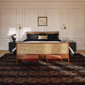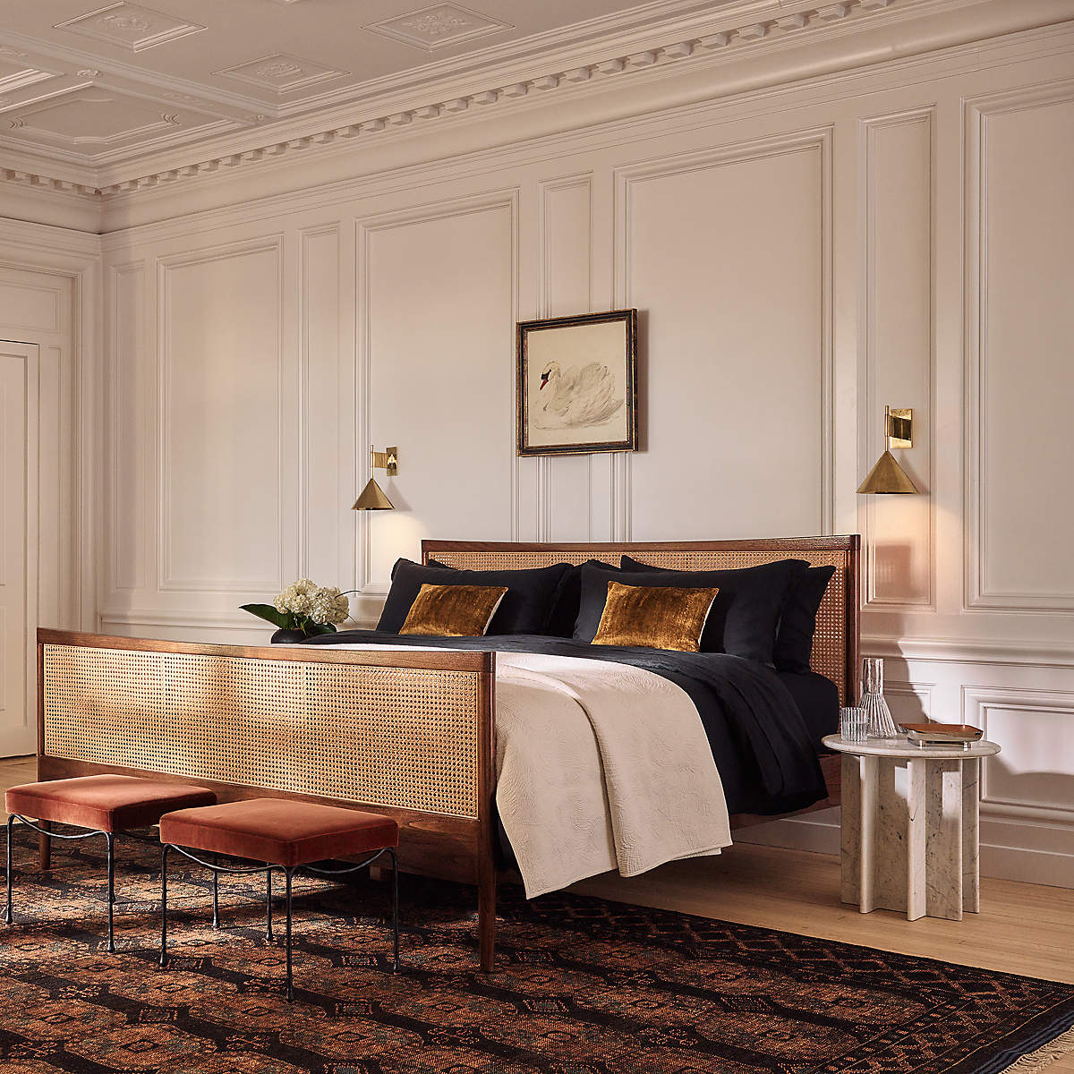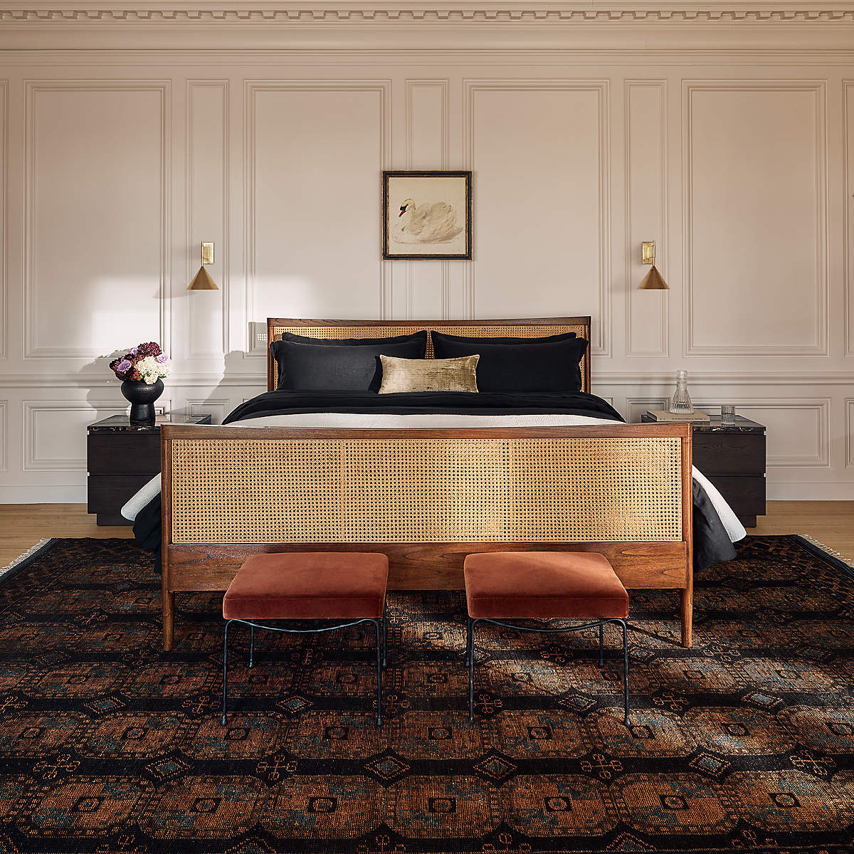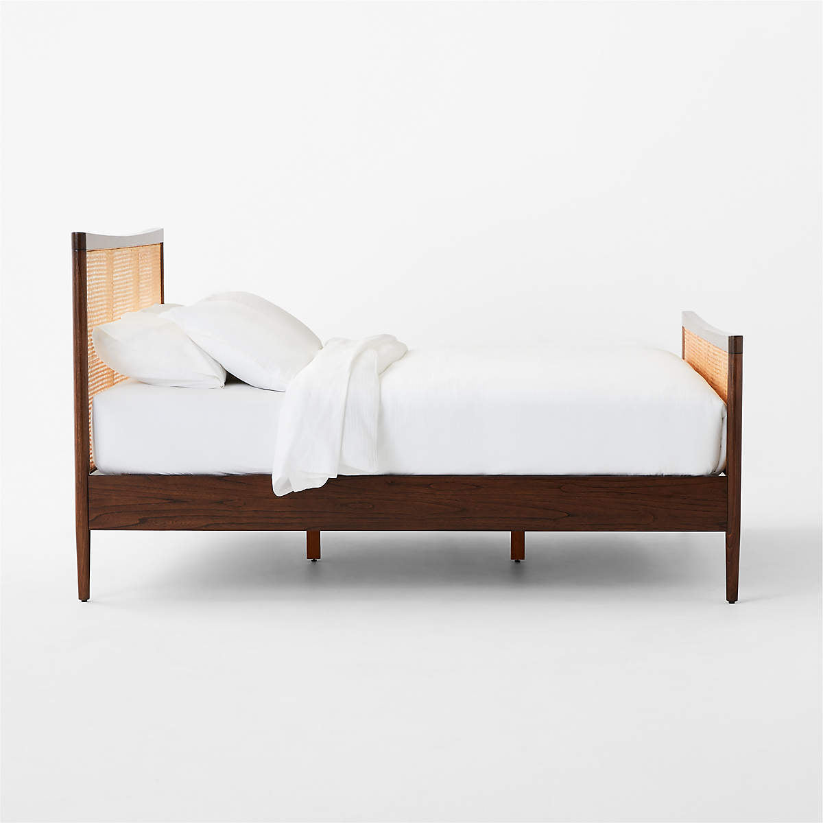 Natural cane bed draws attention with its inviting warmth and organic materiality. Framed in subtly curved sungkai wood, the tall head- and footboard feature open and airy natural cane panels. Rounded legs play counterpoint to the otherwise linear design.