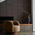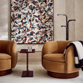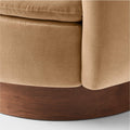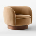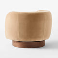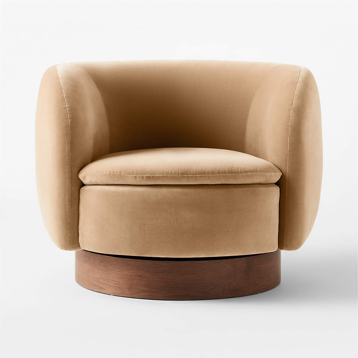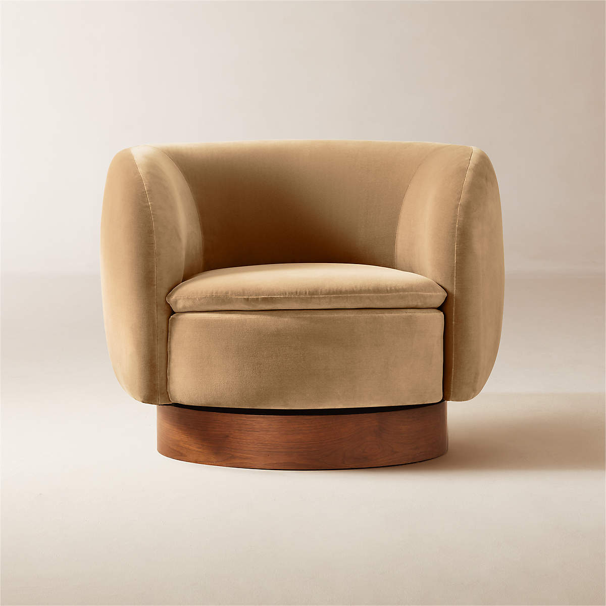 Inviting seat fully swivels 360 degrees, appearing to float above a circular base of wood. Sumptuous camel-colored velvet finishes things off with a luxurious midcentury-inspired moment