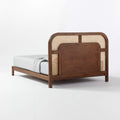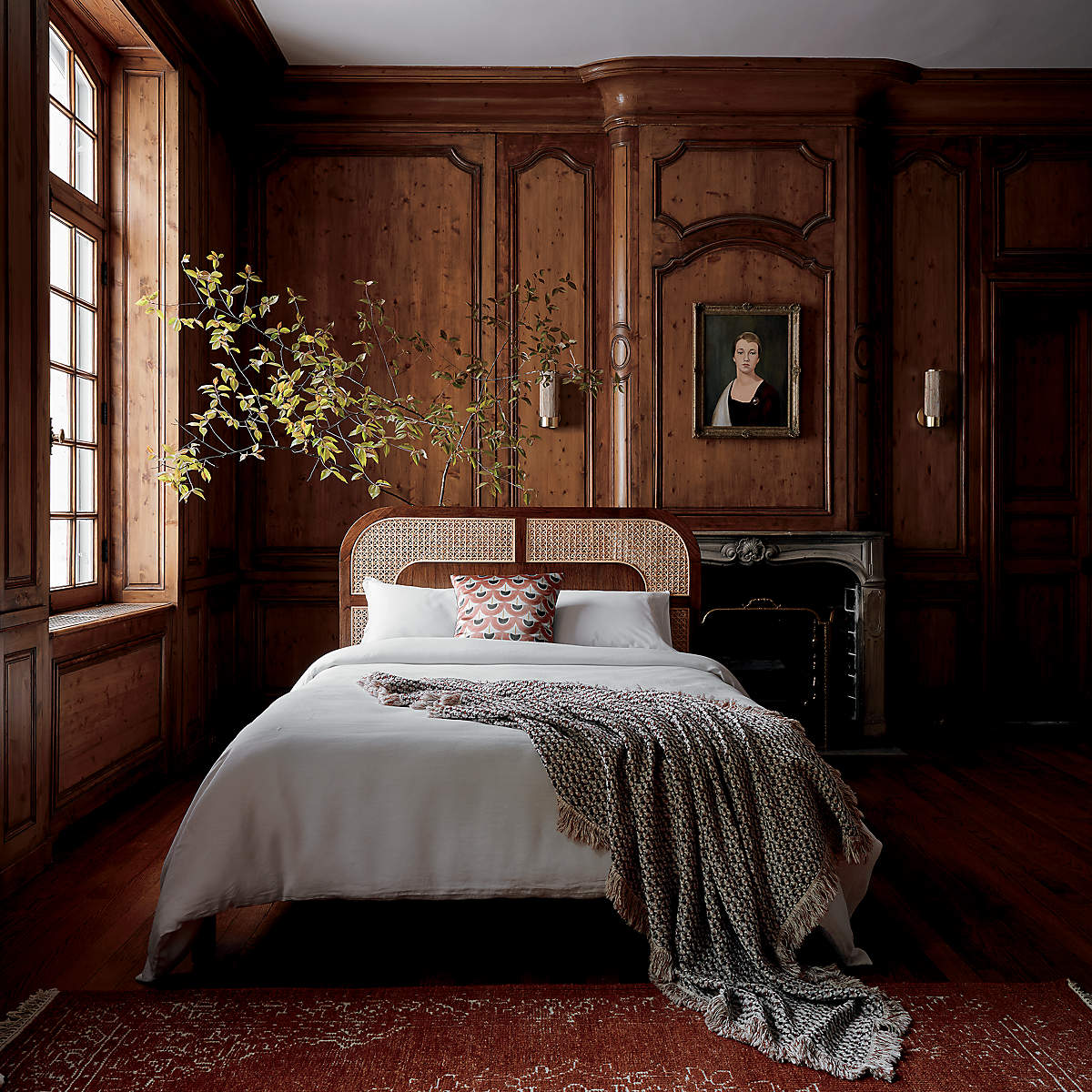 Organic materials and craftsmanship shine in this bed. Natural rattan is woven by hand into a geometric pattern on the headboard and framed in midtone wood.