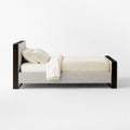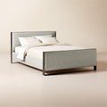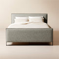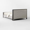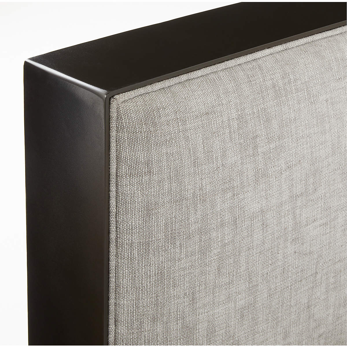 Soft black metal bed is defined by clean lines. Crafted with a blackened steel finish for a soft, subtle sheen, the crisp metal bed features understated accents like textured linen-blend upholstery and a welt trim on the headboard and footboard for contrast
