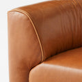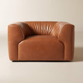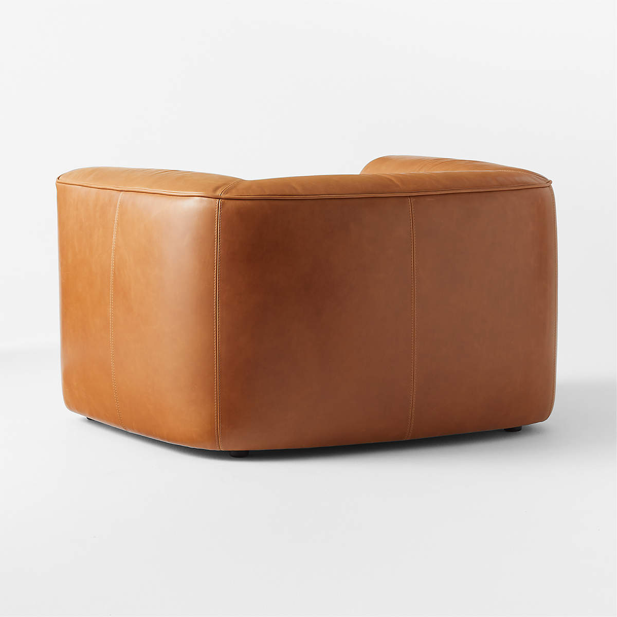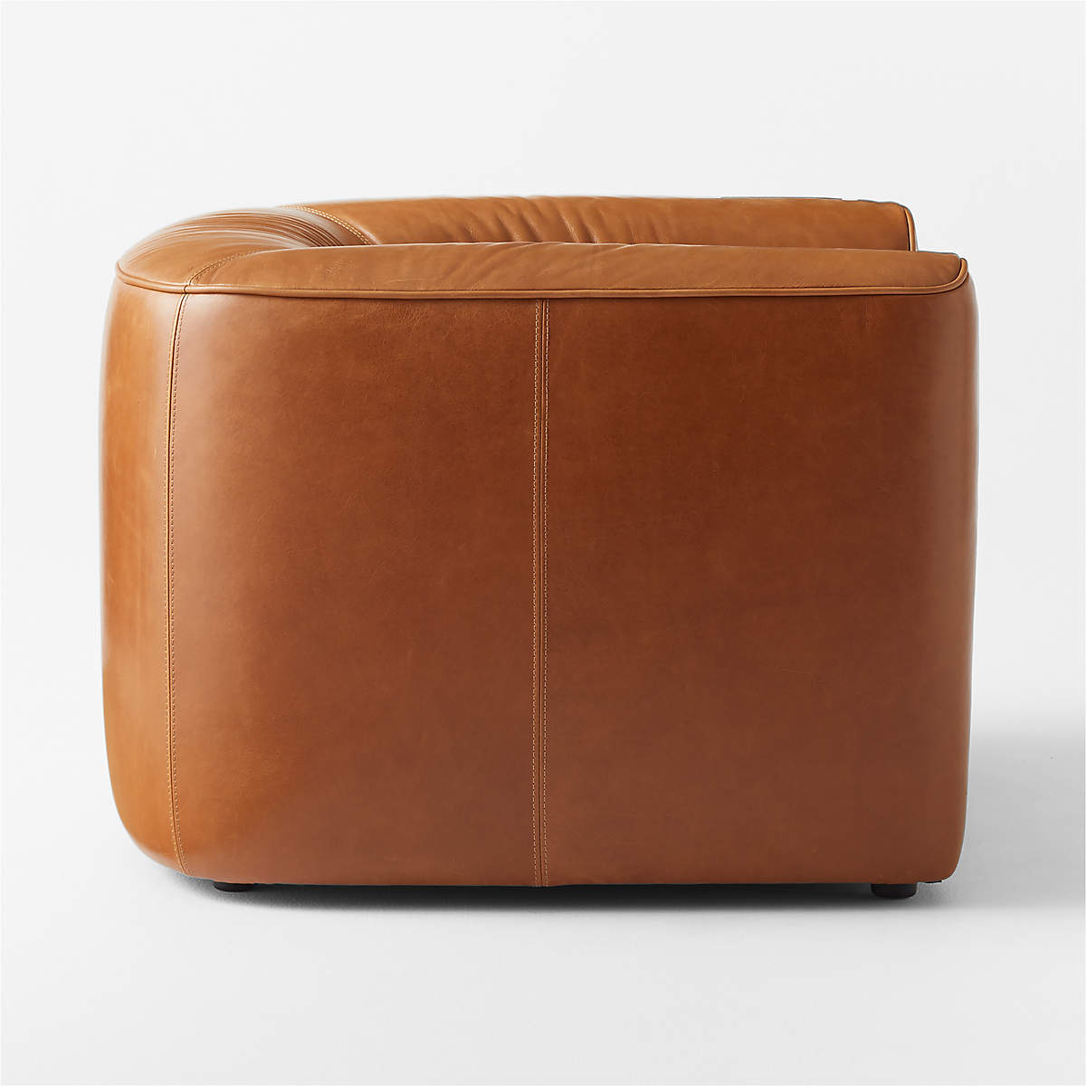 Low-slung leather chair is a modern classic. Featuring a welt trim along the perimeter, the oversized frame is wrapped in full-grain leather with a delicate ruched detail. The hand-stained leather upholstery is individually selected for its inherent markings and characteristics for a naturally worn-in aesthetic.