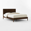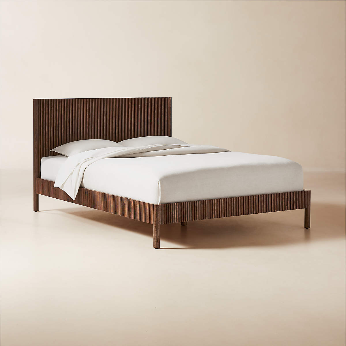 Minimalist yet refined wood bed is beautifully finished with a dark brown stain. Carved fluting on the headboard, footboard and side rails offers refined detail