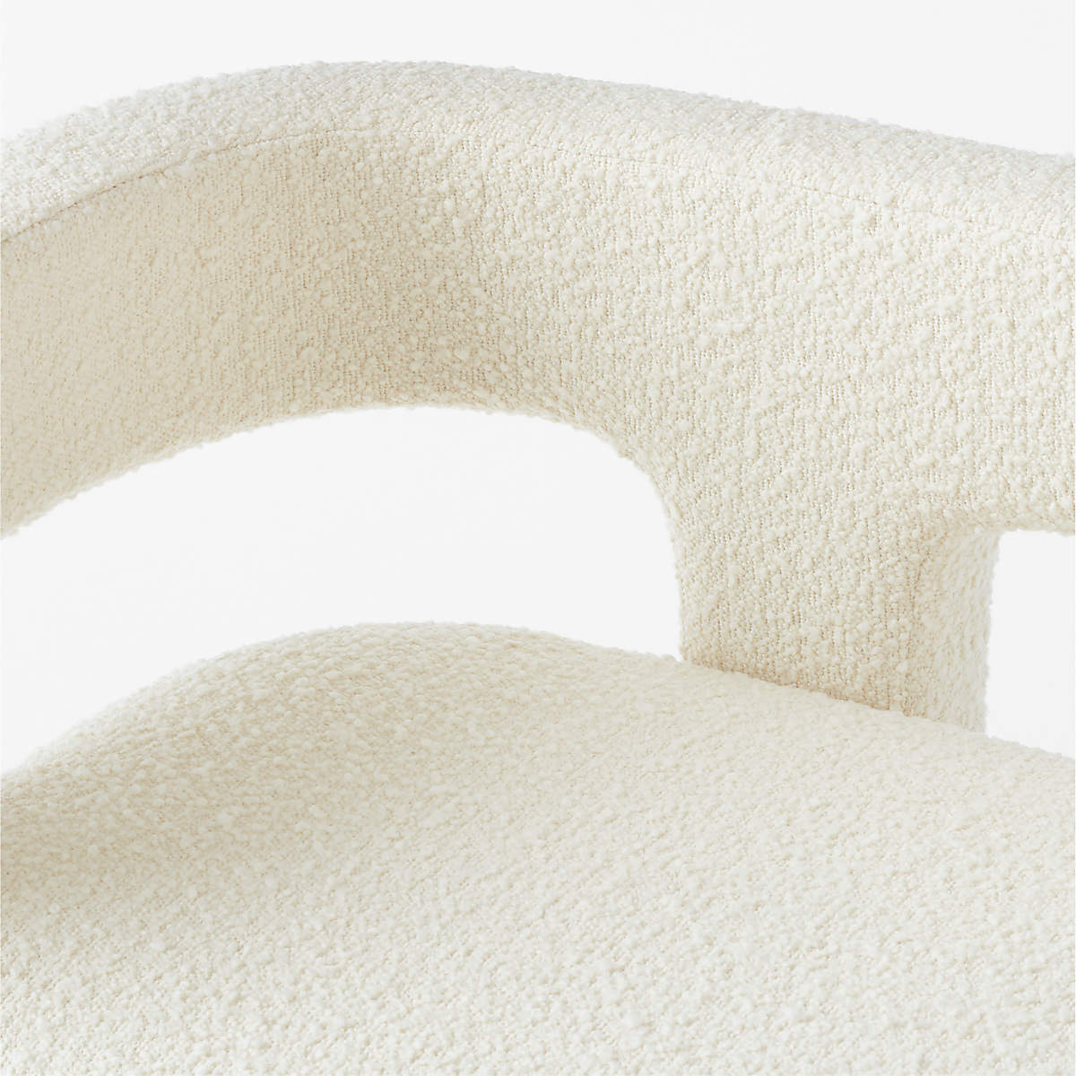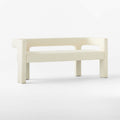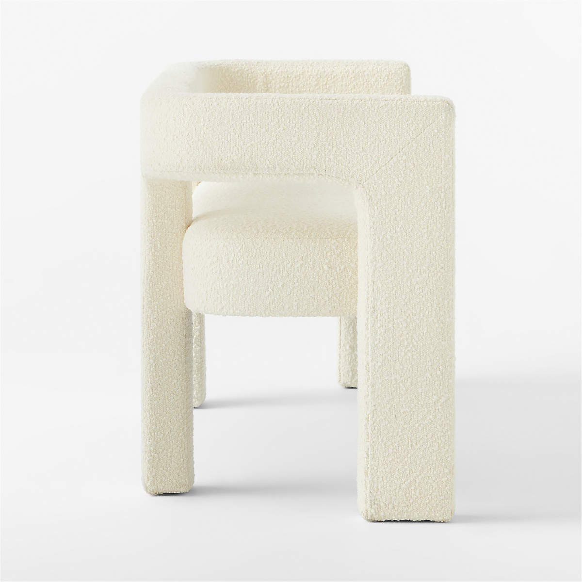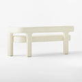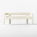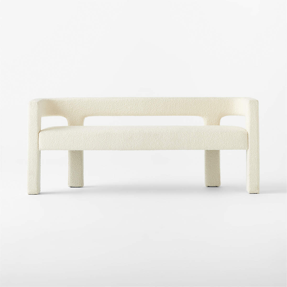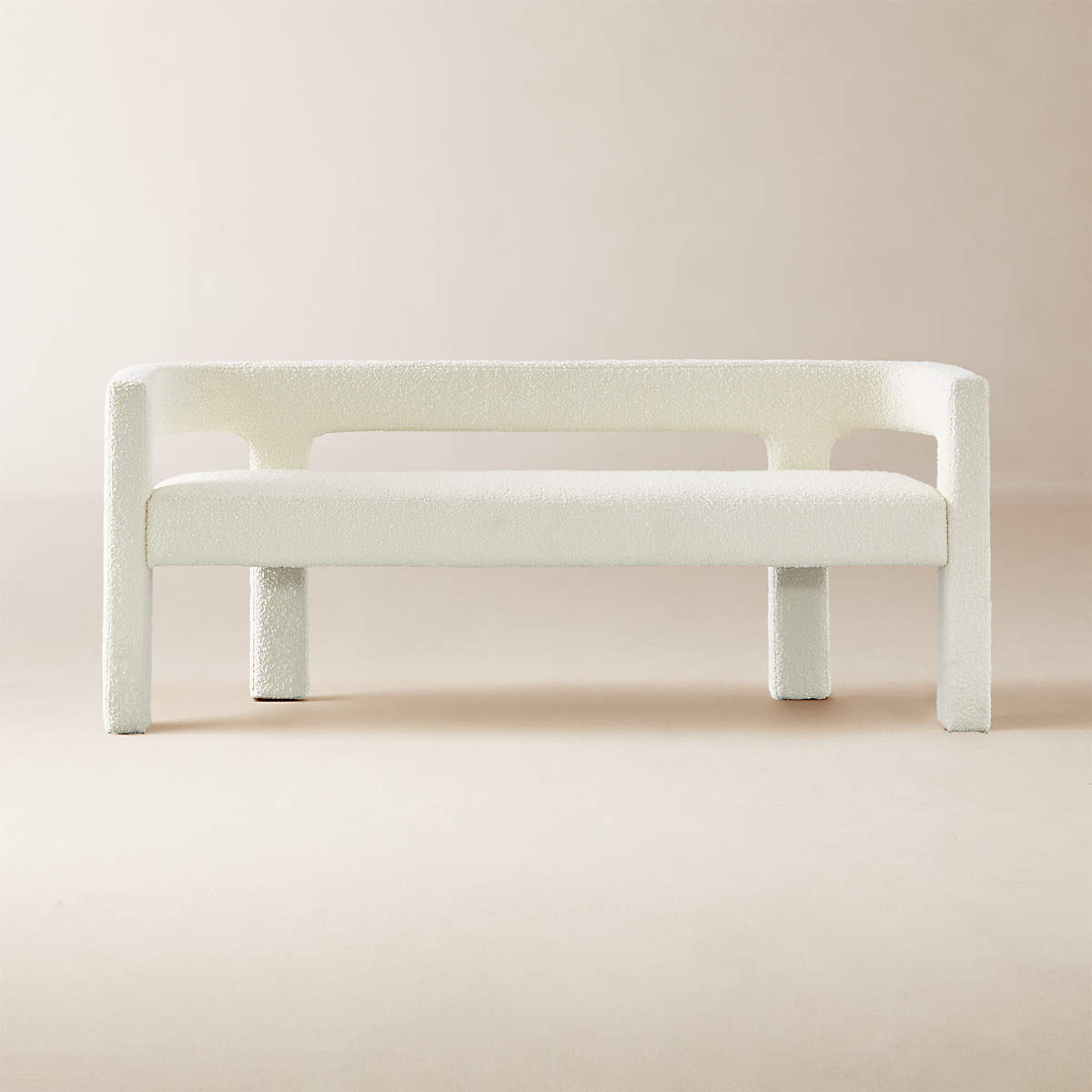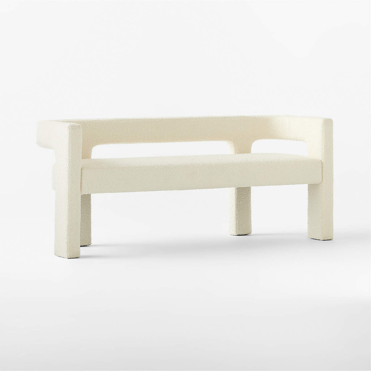 Ivory boucle bench invites two to cozy up. Architectural in profile and plush all around, bench sits deep with a rounded back for extra comfort.